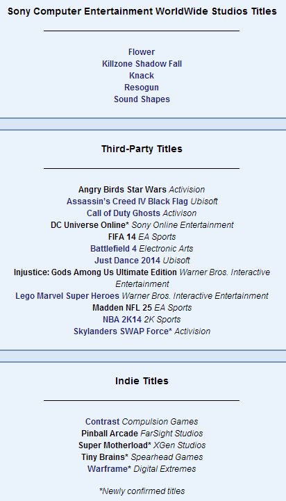Hut ab liebe Publisher! Selten so wenige Spiele zum Launch gesehen, die mich heiß auf die Konsole machen. Bis auf Knack und Assassin’s Creed IV Black Flag interessiert mich der Rest herzlich wenig. Drive Club klang noch interessant, aber das wurde ja verschoben. Noch ein Grund mehr, mit dem Kauf zu warten. Traurig ist, dass es bereits zum Konsolenlaunch schon ordentlich Last-Gen-Recycling gibt: Flower, Sound Shapes, AC IV Black Flag, Call of Duty Ghosts, Battlefield 4, Lego Marvel Super Heroes, Angry Birds Star Wars, FIFA 14, Injustice, Skylanders Swap Force, Just Dance 2014, NBA 2K14, Madden NFL 25 – also im Prinzip alles, was von 3rd Parties kommt bzw. min. 13 von 21 Launch Titeln sind auch auf der PS3 erhältlich. Schon irgendwie erbärmlich. Zum Launch der PS3 gab es ebenfalls 21 Launch Games, auch damals gab es nur wenige Perlen, z.B. Resistance: Fall of Man. Aber wenigstens wurden weniger Spiele vom PC recycled (z.B. FEAR oder Elder Scrolls: Oblivion).