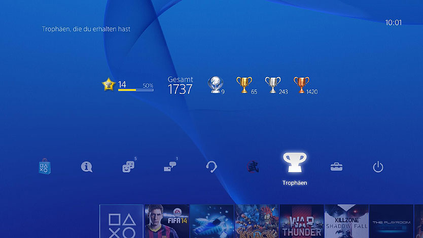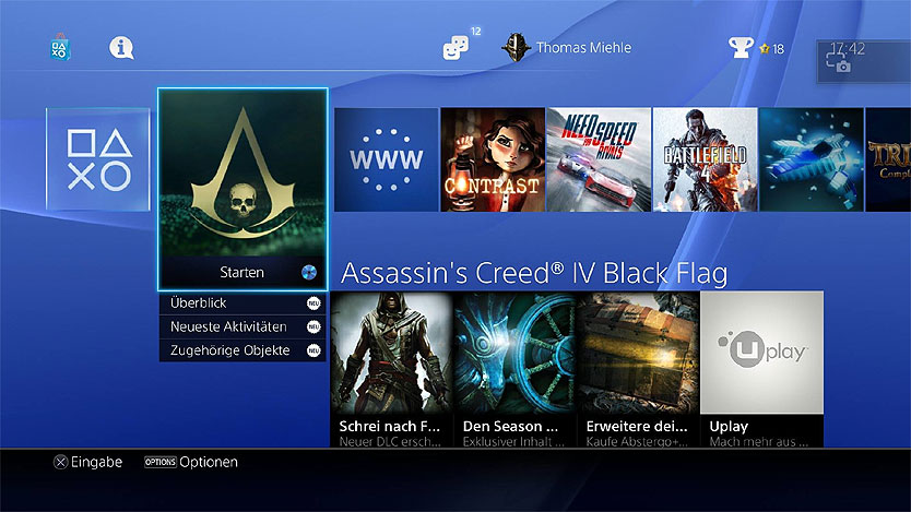 Natürlich hat Sony nicht nur die Hardware verbessert, sondern auch die Systemsoftware einer Generalüberholung unterzogen. Deshalb verschwindet das von der PS3 bekannt XMB und weicht einem deutlich modernerem Design mit Kacheln und zwei Ebenen. Die erste Ebene liegt im Vordergrund und ist auch die meiste Zeit sichtbar. Darauf sind alle installierten Spiele, Neuigkeiten und Apps in einer horizontalen Leiste in Form von Kacheln angeordnet. Zudem kann man sich zu jedem Spiel sich einige Aktivitäten von anderen Usern anschauen oder sich Informationen zum Spiel, wie die Website oder das Handbuch durchlesen. Bei ein paar wenigen Spielen und Apps funktioniert das System auch sehr gut, aber sobald es mehr werden, wird das System mehr als nur unübersichtlich, da es keinerlei Möglichkeit gibt die Kacheln zu ordnen. Das zuletzt benutzte Spiel steht einfach vorne und das war es schon. Keine Ordner, keine Sortierung, es gibt einfach nichts und dürfte recht schnell zu Problemen führen. Zwar kann man Spiele löschen, aber das ist in doppelter Hinsicht ärgerlich. Denn nun kann man ähnlich wie bei der Vita nur alles oder nichts vom Spiel löschen. Wenn ihr also nur die Kachel bzw. die Spielinstallation löschen wollt, müsst ihr euch auch von euren Spielständen verabschieden, sofern ihr keinen PS+ Account für Cloud-Spielstände habt. Hier muss Sony also noch unbedingt nachbessern. Glücklicherweise kann man sich dafür aber recht einfach von den Spielinstallationen trennen. Denn während es bei der PS3 noch mit langen Wartezeiten verbunden war, installiert die PS4 das Spiel im Hintergrund komplett auf die Festplatte während ihr schon spielen könnt. Dazu müsst ihr nach Einlegen meist nicht länger als eine Minute warten und könnt dann direkt loslegen. Je nach Spiel wird die Installation aber anders gehandhabt. In Killzone wird beispielsweise direkt mit der Kampagne gestartet und FIFA wirft euch direkt in ein Spiel zwischen Barcelona und Real Madrid und erst nach dem Spiel steht das komplette Spiel zur Verfügung. Die komplette Installation der Spiele hat jedoch einen entscheidenden Vor- und auch Nachteil. Denn sobald das Spiel einmal komplett installiert ist, fungiert die Spieldisk nur noch als DRM-Schutz und das Laufwerk wird geschont. Jedoch sind in der neuesten Konsolengeneration die Spielegrößen exponentiell gestiegen und belegen schon mal gerne 40GB auf der Festplatte. Bei einer 500GB Festplatte, wovon man nur 430GB nutzen kann, kommt man also schnell in Platzprobleme. Glücklicherweise erlaubt Sony den Austausch der Festplatte und man kann jede beliebige 2,5“ Festplatte mit 9,5mm Bauhöhe einbauen und aktuell so bis zu 1,5TB nutzen.