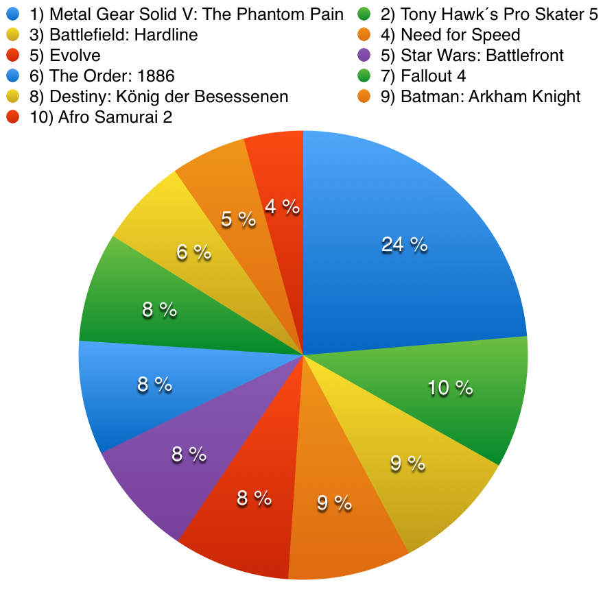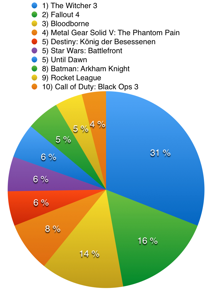 Der unangefochtene Sieger der Abstimmung ist jedoch The Witcher 3: Wild Hunt vom polnischen Entwickler CD Projekt Red. In der Haut von Geralt von Rivia habt ihr die Monster dieser Welt gejagt und die zierliche Ciri vor dem Bösen gerettet. Durch die spannenden Quests, einen riesigen Umfang und eine atmosphärische Welt konnte sich das Spiel über 20% der Stimmen sichern, was problemlos zu Platz 1 gereicht hat. Glückwunsch!