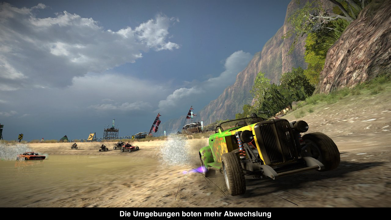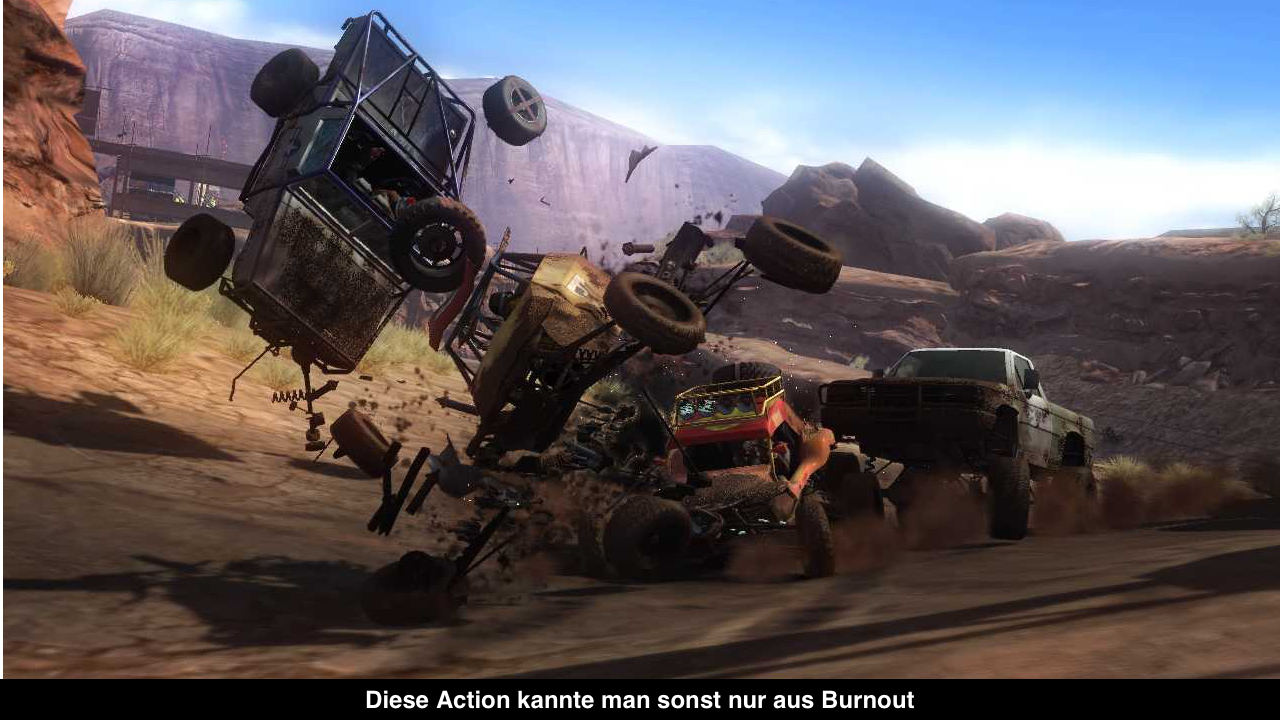 Auch das Setting das Spiels war eine erfrischende Abwechslung zum immer größer werdenden Einheitsbrei der Spielekonkurrenz. Statt auf abgesteckten Rennstrecken zu fahren, gibt es hier Rennen in einem riesigen Canyon. Man kann von der Strecke stürzen, in Felsspalten hängen bleiben oder sich um einen einzelnen Baum wickeln. Vor allem die Streckenführung verdient viel Lob, denn es gab für die einzelnen Fahrzeugklassen jeweils eigene Wege und so bekam man mit anderen Fahrzeugen auch völlig andere Rennen. Passend dazu gab es einen grandiosen Soundtrack voller Rockmusik, der einfach perfekt zu der Festivalatmosphäre passte. Überhaupt die Idee des Festivals war toll und wurde überraschend gut vom Spiel eingefangen.