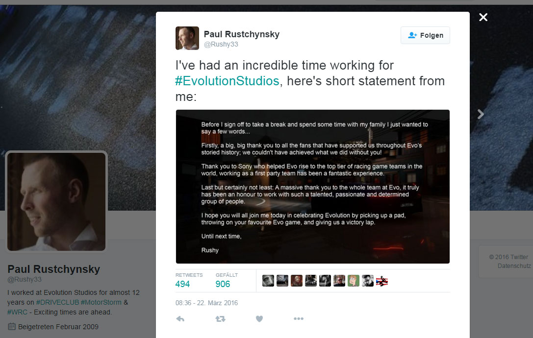 Nun geht eine Ära eines der besten Rennspiele-Entwicklers zu Ende und wir bekommen somit wohl kein Driveclub 2 oder Motorstorm 4 mehr. Dabei schaut man sich heute den Motorstorm Trailer der E3 2005 an und merkt, dass es gar nicht mehr so utopisch aussieht, wenn man z.B. Driveclub betrachtet. Evolution Studios hätten ihre Vision von damals heute sicherlich umsetzen können, dazu wird es aber nicht mehr kommen. Selbst HD-Remakes sind wohl außerhalb des Möglichen, weil der Markt sich weiterentwickelt hat. Rennspiele interessieren nur noch eine Minderheit, außer es steht der Name Gran Turismo, Forza oder Need for Speed drauf. Arcade-Rennspiele sind bis auf Mario-Kart längst tot und so ist Driveclub VR möglicherweise das letzte Geschenk der Evolution Studios an uns, wenn Sony sich dazu entscheidet das Projekt irgendwie zu Ende zu bringen. Wobei es schon mit dem Teufel zugehen müsste, damit man das Spiel nicht irgendwie herausbringt. Einerseits machte es einen sehr fertigen Eindruck und andererseits wäre man somit konkurrenzlos im Rennspielbereich auf der PlayStation VR. Theoretisch soll Gran Turismo Sport das Gerät ebenfalls unterstützen, aber seit dem Trailer zum Spiel hat man nichts mehr davon gehört. Die Beta im Frühjahr wirkt auch immer unwahrscheinlicher und die Vergangenheit hat gezeigt, dass man zwar viel ankündigt in Bezug zu Gran Turismo, aber nicht immer alles zum Start dann auch bereitsteht. Lasst uns also hoffen das Sony sich erbarmt und zumindest noch Driveclub VR veröffentlicht, damit die Arbeit dieser passionierten Menschen nicht umsonst war. Ich bin mir aber sicher das wir nicht das letzte mal von den Entwicklern gehört haben - Hoffen wir es.