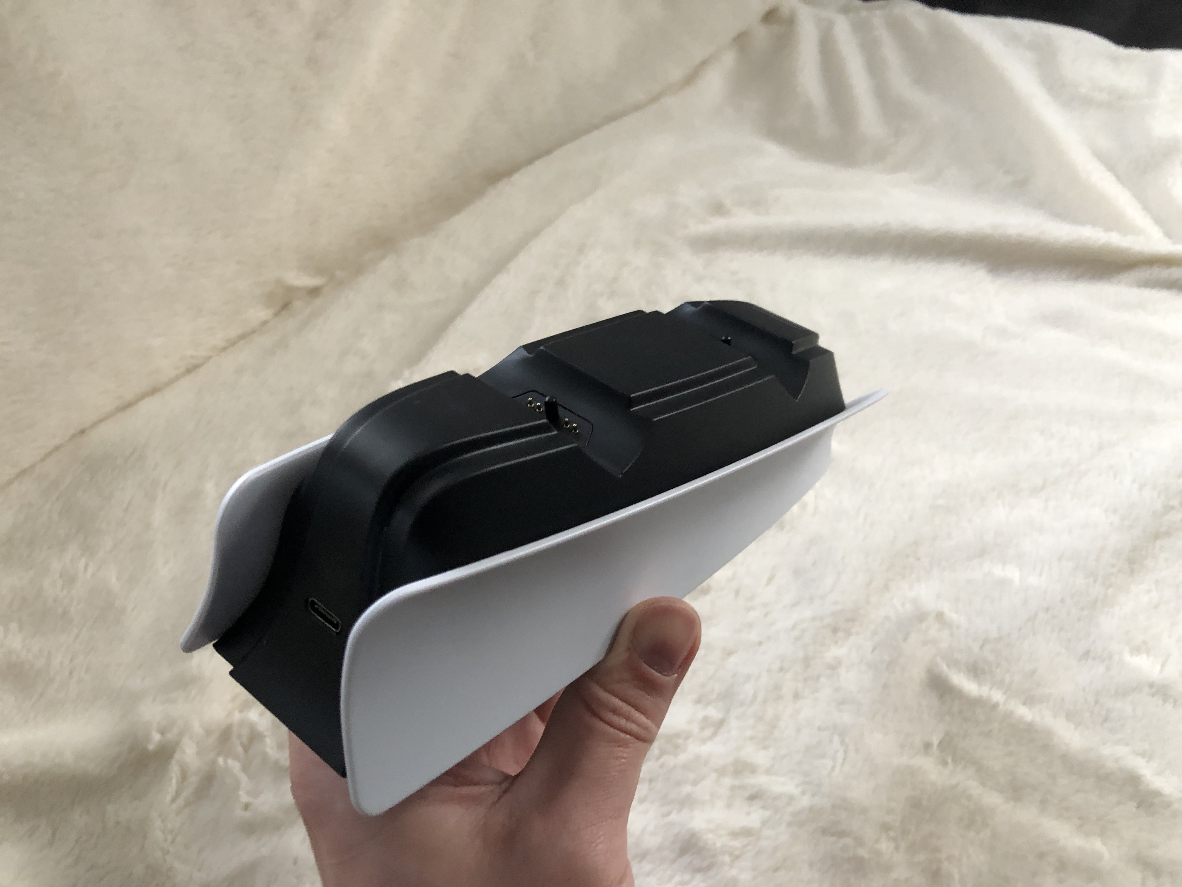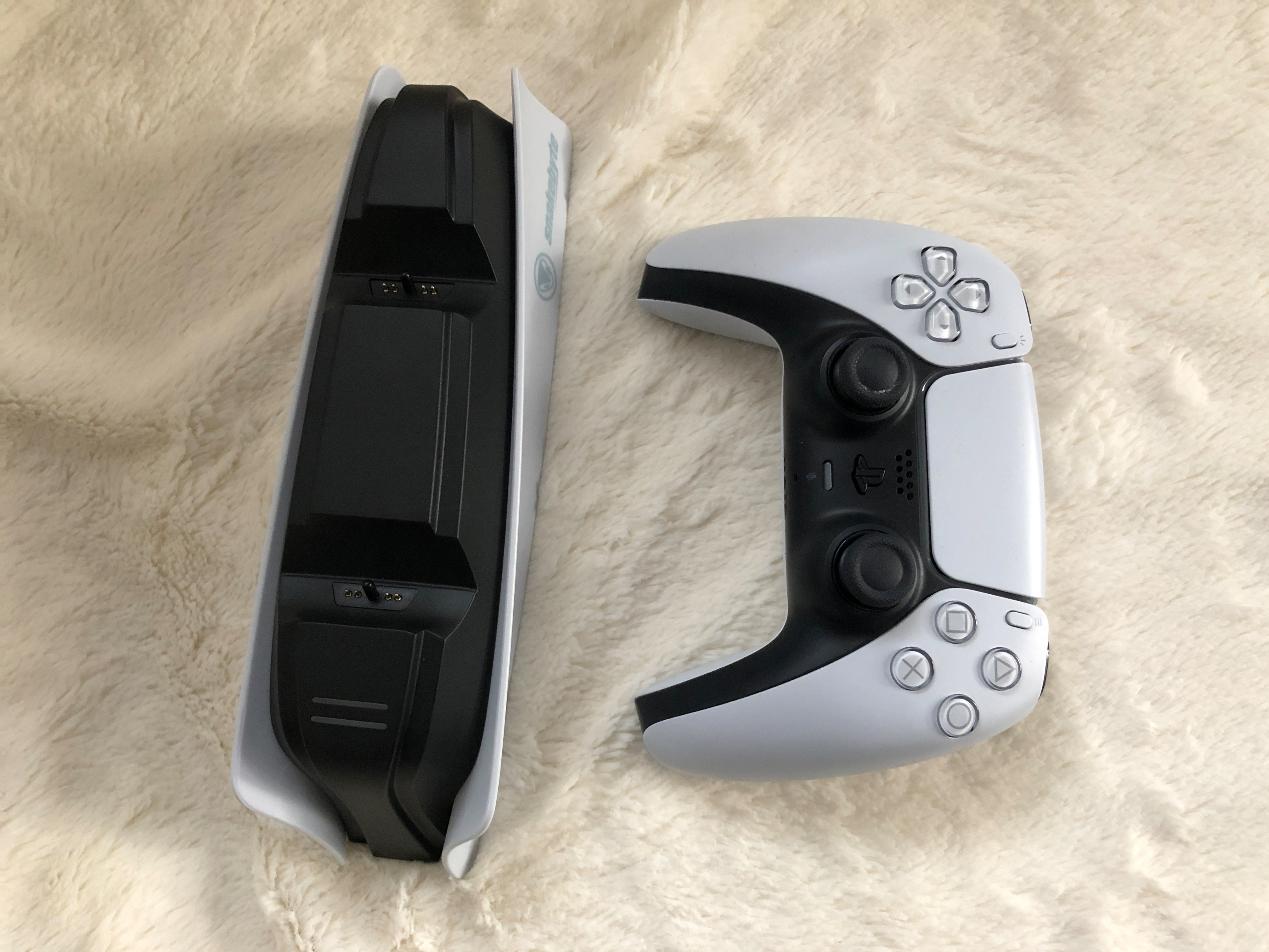 Bei der offiziellen Sony Variante, kann man die Ladestation nur an eine normale Steckdose hängen. Das hat Vor- aber auch Nachteile. Ich fand es anfangs eigentlich eher als Vorteil, da ich so die Ladestation auch auf dem Fensterbrett neben der Couch postieren könnte. Wenn man natürlich alles bei der PS5 Konsole haben möchte, ist das natürlich eher hinderlich. Die Twin:charge 5 schließt man direkt an die PS5 via USB an. Hier fehlt ein dedizierter Adapter, den man jedoch nachkaufen kann. Man muss lediglich beachten, dass die Leistungsaufnahme 5V / 1,5 A beträgt. Allerdings kostet das natürlich wieder Geld.
