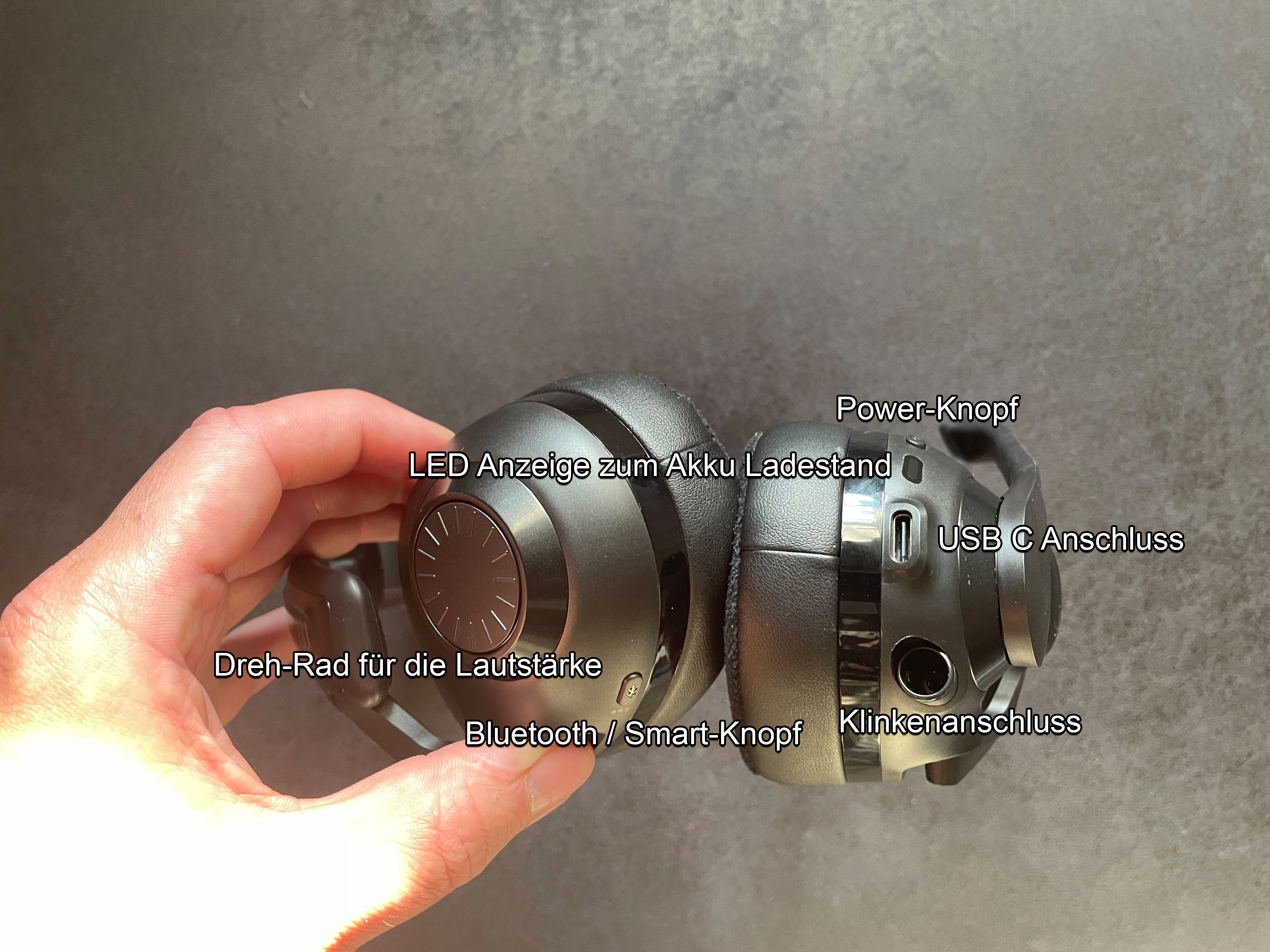 Das Headset kommt ab Werk bereits mit einem zumindest halbvollen Akku daher. Ansonsten lädt man es via USB Kabel an einer Steckdose oder dem PC einfach auf. Neben der deutschen Sprachausgabe (die den Nutzer beim Anschalten informiert), kann man den Akkustand auch an einer LED Leuchte am Headset ablesen (grün = voll; gelb = halbleer; rot = leer). An der Konsole kann man somit gleich starten, da man hier sowieso ein Kabel benutzen muss (siehe auch weiter unten). Das Bluetooth Pairing via Telefon und TV wird mit einem der zwei Knöpfe am Headset gestartet, dazu hält man die Taste drei Sekunden gedrückt. Alle meine Geräte haben das Headset problemlos erkannt und die kabellose Verbindung / Übertragung war ebenfalls stabil und ohne Aussetzer. Dieser Knopf dient auch als Smart-Button zum Durchschalten der Voreinstellungen bzw. zum Annehmen eines Telefonats. Am Anfang ist das etwas gewöhnungsbedürftig, aber nun gut, womöglich gibt es ja Zocker die diese Funktion nutzen. Die Lautstärke wird dagegen mittels Dreh-Rad an der Außenseite der rechten Ohrmusche justiert. Wenn man das Mikro nicht nutzen will, klappt man es einfach nach oben, beim runterdrücken, wird es dann auch wieder aktiviert – nennt sich Lift to mute.