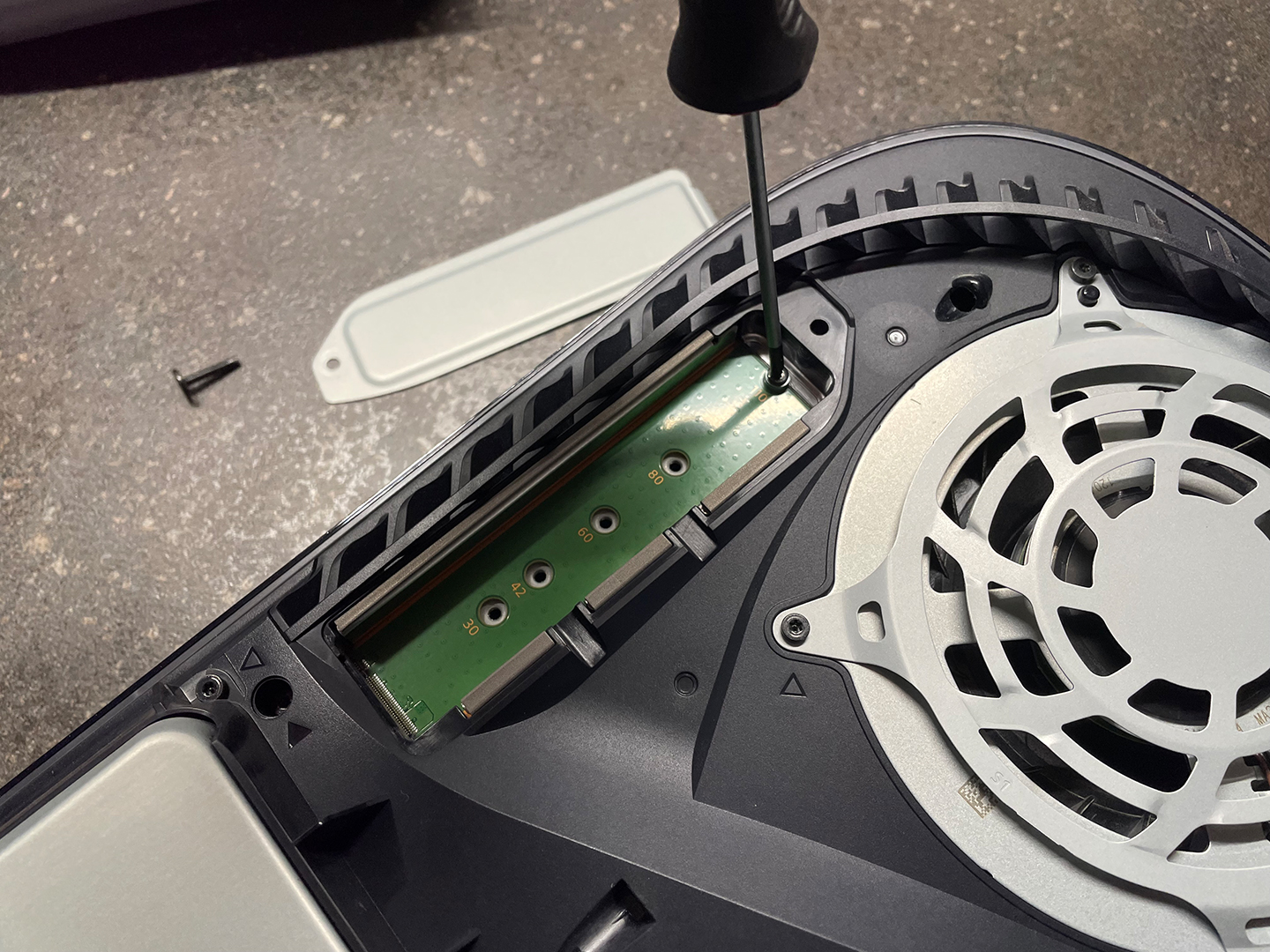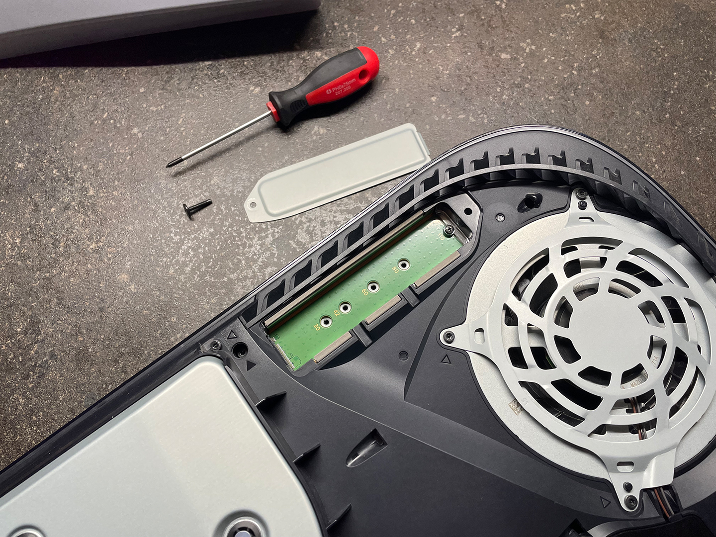 Nun wird die Abdeckung wieder draufgeschraubt und die Faceplate der PS5 wieder auf die Konsole draufgeklickt.