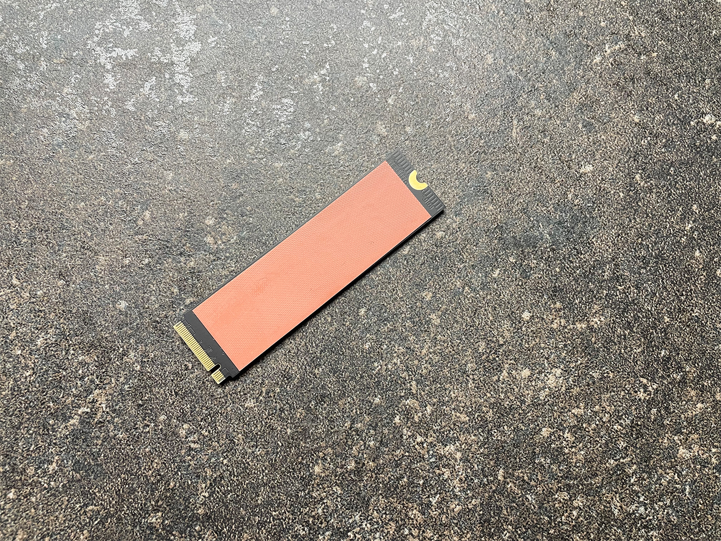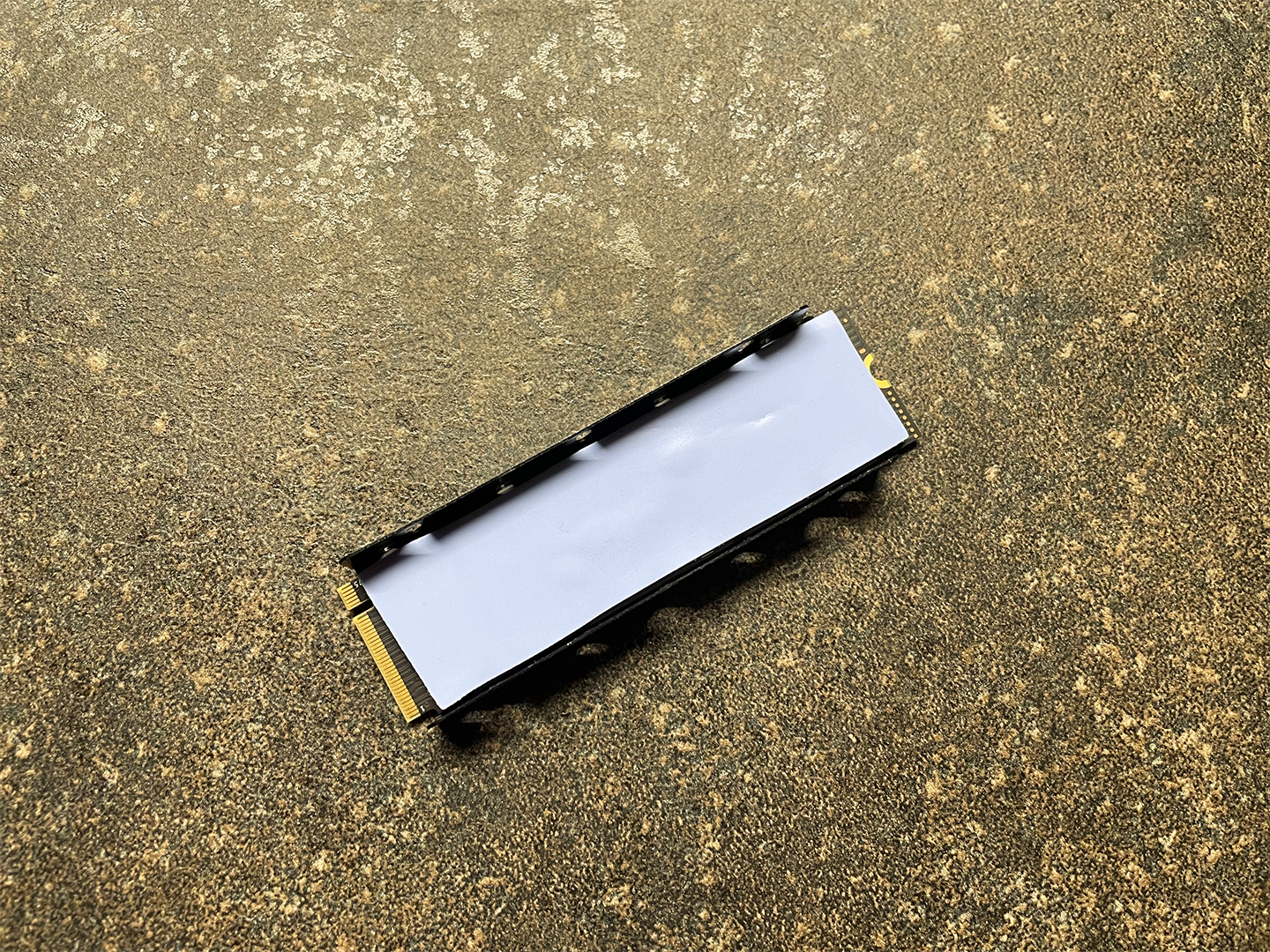 Als nächstes wird das 0,5 mm starke Silikonkissen (rosa) auf die Alu-Unterseite der SSD aufgebracht - wichtig: nicht auf die goldenen Sachen kleben; die halbrunde Öffnung wird für die Befestigungsschraube in der PS5 gebraucht