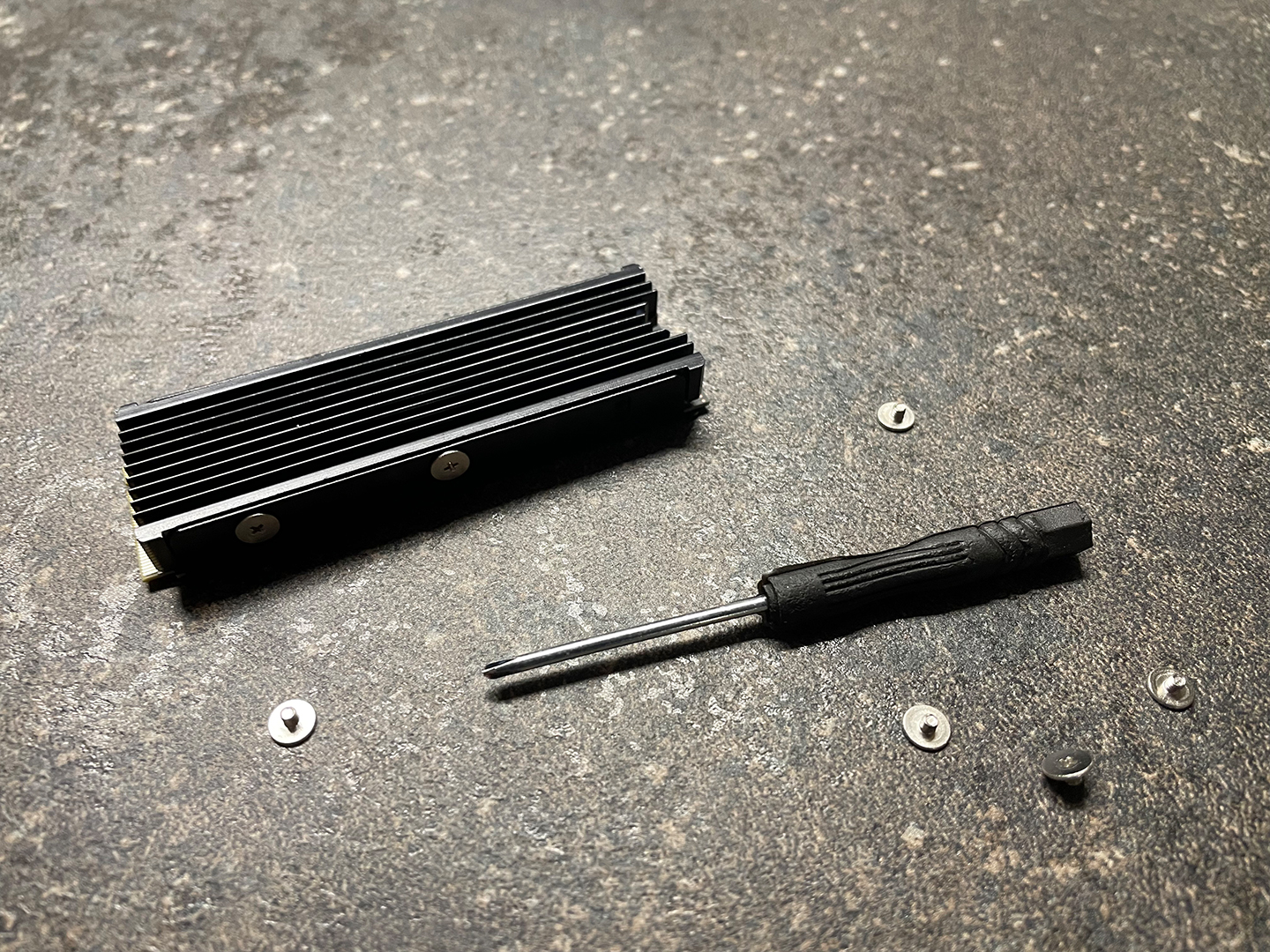 Nun wird die SSD mit dem Kühlkkörper via sechs Schrauben verbunden