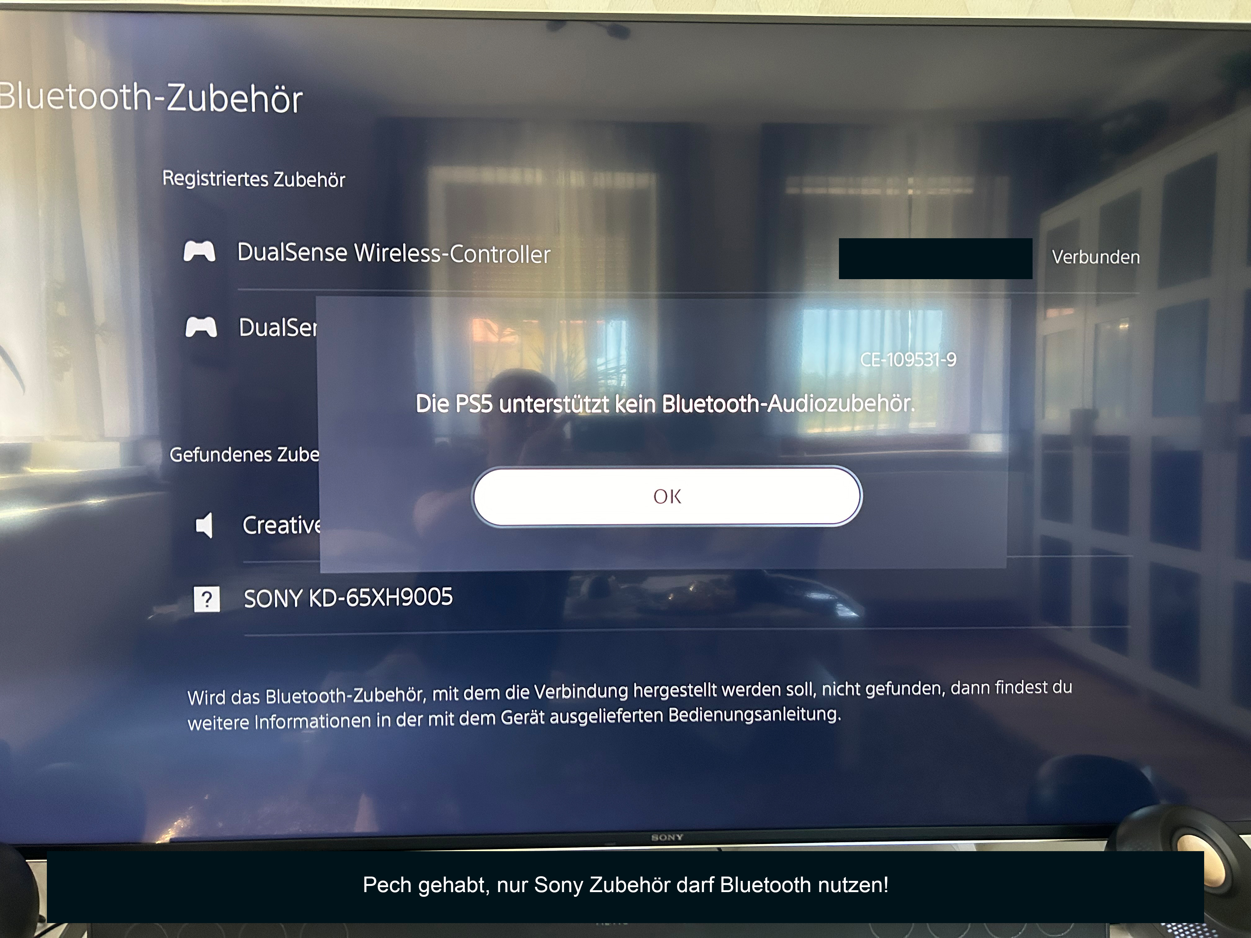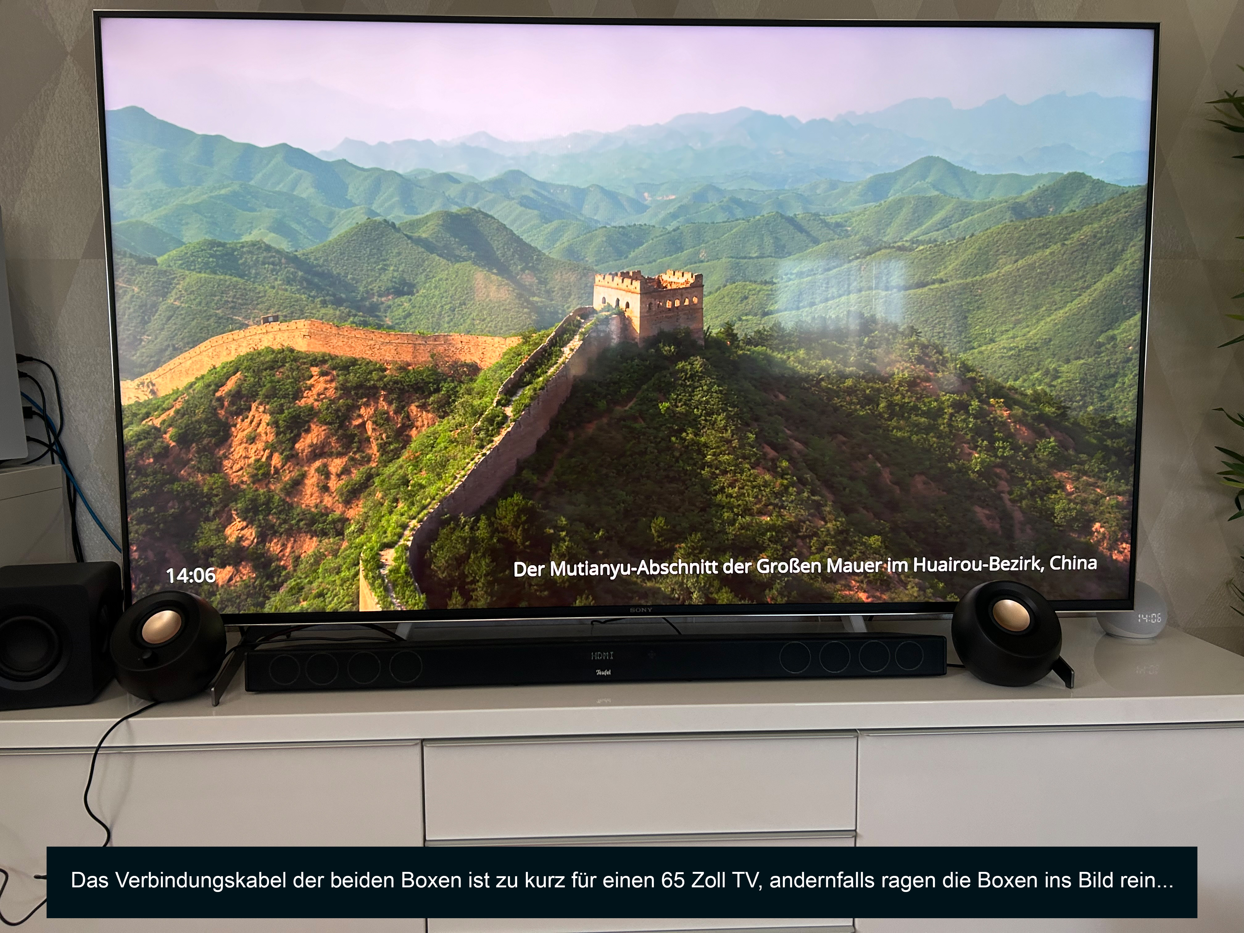 Ich benutze zu Hause einen 65 Zoll TV, der auf zwei Standfüßen steht und sich auf einem Highboard befindet. Die Teufel Soundbar (siehe ONPSX Test) passt genau zwischen die zwei Füße, ohne dass sie oben ins Bild ragt. Bei den Pebble X Boxen fällt das fixe Verbindungskabel zwischen den Geräten zu kurz aus, so dass ich die Boxen nicht neben den TV auf das Highboard stellen konnte. Unter dem TV ragen die Schalen jedoch ins Bild rein. Optisch ist das schon mal nicht schön. Zudem gilt es beim Anschluss an eine PS5 einiges zu beachten: Über Bluetooth lässt sich das Gerät gar nicht erst mit der Konsole koppeln, denn das verbietet Sony für Drittanbieter. Bleibt also nur der Anschluss via USB-C an der Front. Dann funktioniert das System wie ein kabelgebundenes Headset (und wird auch als solches von der PS5 erkannt), oder man geht den Weg über das TV-Gerät (Bluetooth, 3,5mm AUX oder USB-C). Bei meinem TV fiel die Bluetooth Wiedergabe via TV ziemlich leise aus (man musste die Lautstärke schon ordentlich aufdrehen), besser war das Ergebnis über den Kopfhörer-Anschluss. Ähnlich fiel der Test beim Betrieb via USB-C Kabel an der PS5 aus.