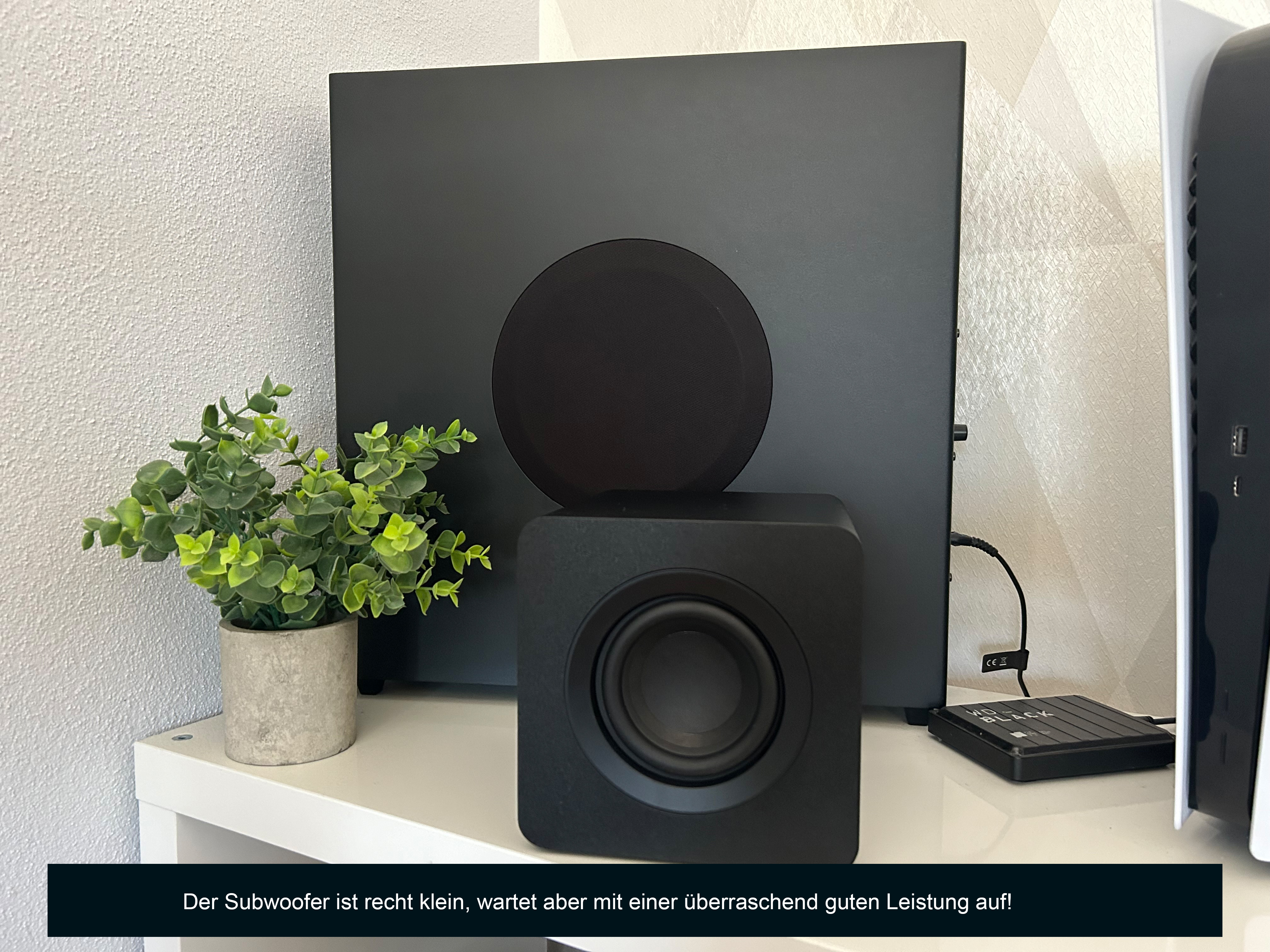 Doch kommen wir nun zum Sound. Folgende Eindrücke stammen von der Anschlussvariante mit USB PD Adapter und Steckdose. Der Bass ist laut und satt, was wirklich überraschend bei der kompakten Größe des Subwoofers ist. Die Höhen sind ebenfalls prägnant, nur die Mitten gehen im Mix unter bzw. werden von Höhen und Tiefen überlagert. Bei manchen Spielen wie The Crew Motorfest macht sich das weniger bemerkbar, aber in Gran Turismo 7 war das schon eine Grenzerfahrung. Die Musik konnte man zum Beispiel nur kaum hören und bei vielen Fahrzeugen auf dem Bildschirm driftete der Sound eher ins Dröhnen ab. Generell erledigten die Boxen bei Spielen mit einfachen Soundkulissenwänden einen besseren Job. Da die IOS App keine detaillierten Einstellungen zulässt und sich die PC App nicht herunterladen lässt, werden die verschiedenen Audiotechnologien wie BassFlex, Acoustic Engine, EQ und Dialog+ automatisch zugeschaltet. Was jedoch nicht immer für besseres Ergebnis sorgen kann. Beim Musik-Streaming fehlen bei gitarrenorientierter Rockmusik ebenfalls die Mitten, während basslastige, elektronische Stücke besser abschneiden. Überzeugende Arbeit lieferten die Boxen dagegen beim Film-Streaming via Amazon ab: vor allem die Stimmen kamen sehr klar rüber, aber auch sonst kann man über das Klangbild nicht meckern. Ihr seht schon, das System bietet ein paar Vorteile, aber eben auch Nachteile. Ohne den Steckdosen Adapter fällt der Sound übrigens deutlich dürftiger aus. Wobei am Schreibtisch mag so etwas alles noch zu verschmerzen sein, mit 3 Meter Abstand auf der Couch in einem mittelgroßen Raum ist das Ergebnis selbst mit Adapter dann doch eher nicht das Gelbe vom Ei. Und mir persönlich wäre das Gebotene dann zu wenig.