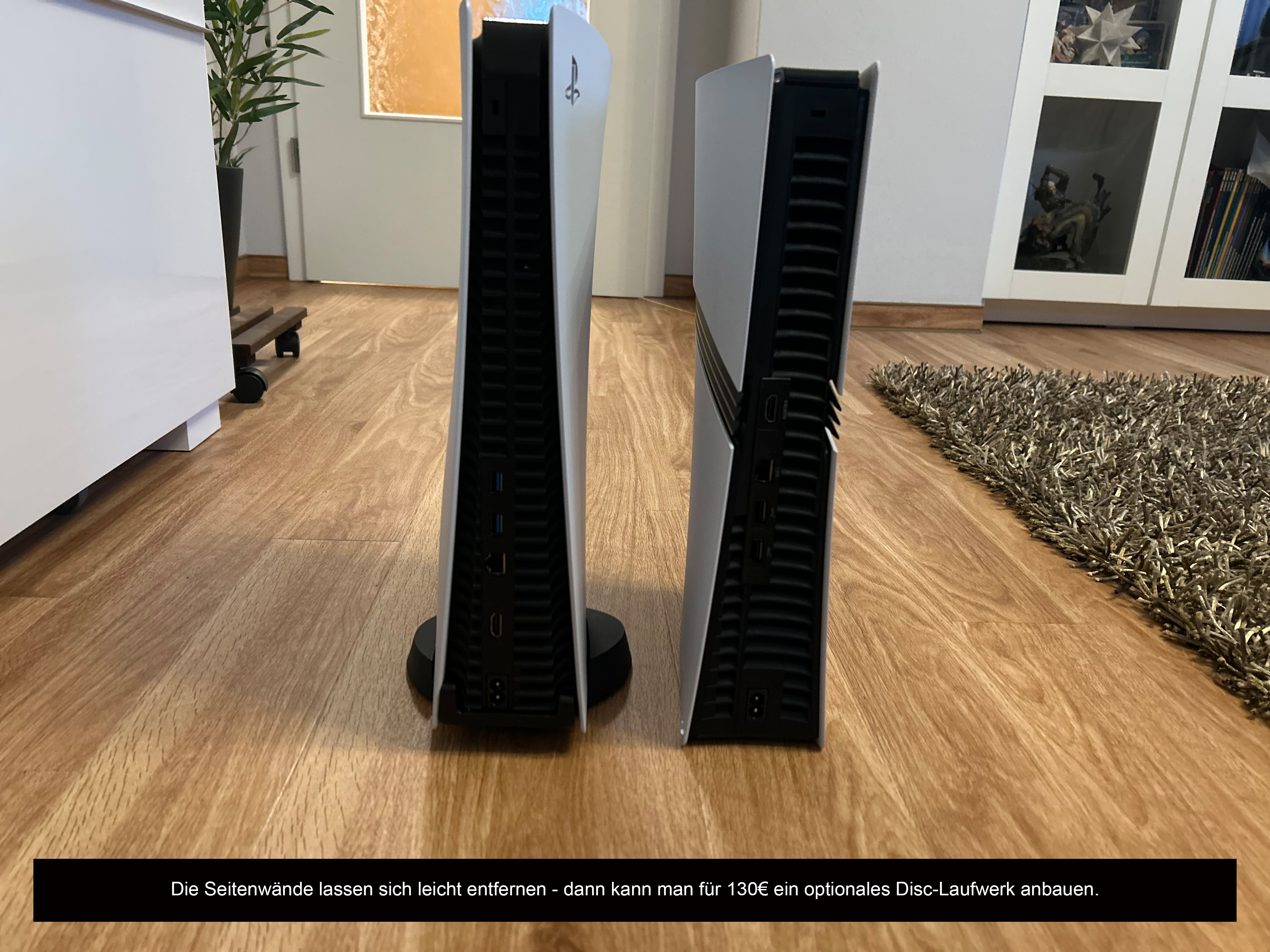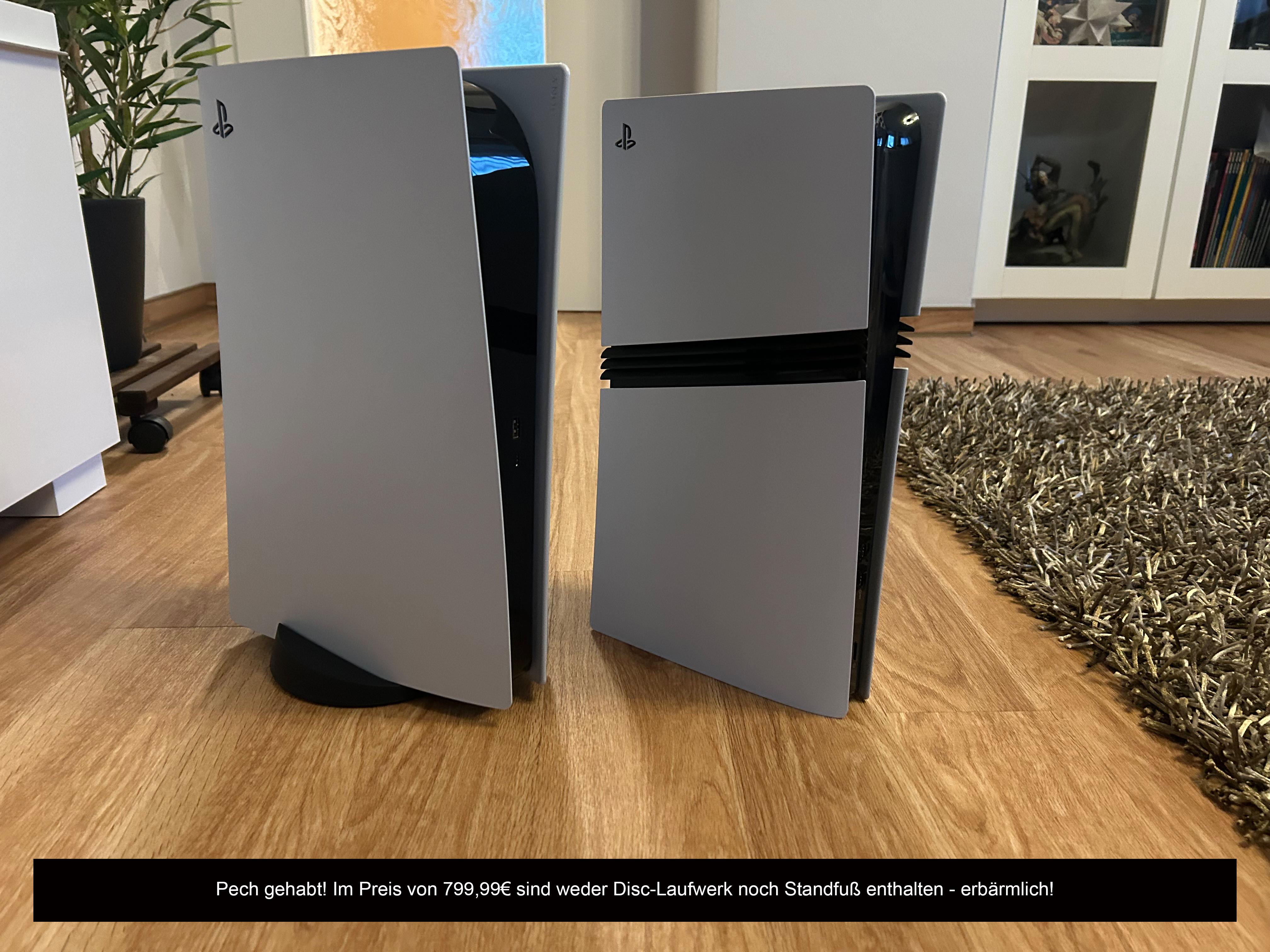 Fangen wir gleich mit dem wichtigsten Punkt an, dem Preis: Dieser beträgt doppelt so viel wie der einer regulären PS5 Konsole. 799,99€ ruft Sony für die neue Konsole auf – wesentlich mehr, als zum Beispiel die 399,99€ für die PS4 Pro! Oder falls sich noch jemand erinnert, der absurde Preis der PS3 – 599,99€! Zu Recht fuhr der Hersteller dafür Spott, Häme und anfangs schlechte Verkaufszahlen ein. Doch wie heißt es so schön? Aus der Geschichte lernt man etwas, oder eben auch nicht. Für Sony, ein multinationaler Konzern, trifft wohl letzteres zu und das Motto „For the Players“ ist längst zur Charade verkommen. Mit der PS5 Pro wird man jedenfalls nicht das Gefühl los, bis auf den letzten Pfennig ausgequetscht zu werden. Warum? Für die rund 800€ bekommt man nicht einmal ein Disc-Laufwerk dazu. Auch einen einfachen Standfuß zum Hinstellen gibt es nicht dazu! Man kann die Konsole nur hinlegen (dafür gibt es zwei kleine Plastikfüßchen, die bestenfalls in der Produktion 1 Cent gekostet haben), was aber mehr Platz in Anspruch nimmt. Hinstellen sollte man sie ohne Fuß nicht, schließlich gibt es auch auf der Unterseite Luftauslassgitter, welche für die Zirkulation der Abwärme wichtig sind. Wer jetzt denkt, einfach von seiner alten PS5 den Standfuß zu nutzen, kennt Sony nicht – natürlich sind nur die Ständer der neueren Slim-Modelle kompatibel. Vielen Dank auch! Ähnlich sieht es auch beim Disc-Laufwerk aus, dass man optional erwerben kann – für schlappe 130€, wenn es denn irgendwo verfügbar ist. Für den Standfuß will Sony übrigens auch noch mal 30€ haben. In Summe macht das dann rund 960€! Dafür bekommt man fast drei einzelne PS5 Konsolen oder bereits einen guten Mittelklasse Gaming PC.