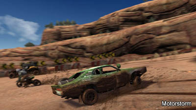 Nach dem E3 2005 Trailer waren natürlich die Erwartungen an das actionreiche Rennspiel enorm hoch und realistisch betrachtet, muss man auch zugeben, dass das aktuelle Spiel dem Trailer nicht ganz das Wasser reichen kann, aber das was trotzdem geboten wird, entspricht definitiv dem, was man von einem Next-Generation Spiel erwartet. Gigantische Grafik und unglaublicher Spielspaß! Wir konnten eine weit fortgeschrittene Preview Build ausführlich und in aller Ruhe Probe spielen und schon jetzt wird klar, Motorstorm hat das Zeug zum Kultspiel. Die Atmosphäre, die Action, die bei den Rennen (gerade spätere Kurse bieten zig alternative Routen mit vielen Sprüngen, Schlamm und Rampen) geboten wird, ist einfach ungeschlagen. Kann sich noch jemand an das damals brachiale Destruction Derby erinnern? Das Spiel ist „Kindergarten2 im Vergleich zu Motorstorm – hier fliegen andere Fahrzeuge neben euch vorbei, rammen sich die Computergegner gegenseitig von der Strecke und das Gefühl, über eine holprige Wüstenstrecke zu fahren, ist schlichtweg perfekt. Insbesondere da sich die verschiedenen Fahrzeugklassen (Motorräder, ATVs, Trucks, Buggys, Muscle Cars usw.) alle unterschiedlich fahren, ohne jedoch zu anspruchsvoll oder zu arcardig zu wirken. Das Spielgefühl ist einfach unglaublich! Dabei macht vor allem das coole Boostfeature Spaß, dass euch einen quasi unendlichen Geschwindigkeitsschub erlaubt, solange ihr damit nicht den Motor überhitzt. Rasen ist somit an der Tagesordnung. Aber denkt ja nicht, dass es einfach ist, die Wagen auf der Strecke zu behalten, denn gerade die vielen Sprünge können euch schnell in Problemsituationen bringen, deshalb ist es ratsam nicht immer mit einem Bleifuß unterwegs zu sein. Aber der Spaß steht trotzdem zu jeder Zeit im Fordergrund. Dazu tragen auch die Computer Gegner bei, die zwar fordernd sind, aber nie unfair fahren (zumindest in den Levels, die wir ausprobiert haben). Bei Kollisionen gewinnt beispielsweise fast immer der Spieler. Grafisch bietet das Spiel wie gesagt das volle Brett, die Autos sehen detailliert aus, genauso wie die Effekte und das Ambiente. Die Framerate hatte nur sehr selten mit kleinen Slowdowns (wenn drei Fahrzeuge auf dem Bildschirm gleichzeitig explodierten) zu kämpfen und lediglich die Bodentexturen könnten in manchen Ecken besser aufgelöst sein. Auch ist das Fehlen der Cockpitperspektive etwas ärgerlich, denn somit existieren nur zwei Perspektiven, Stoßstange und hinter dem Auto. Zum Ausgleich gibt es dafür eine tolle optionale Tilt-Steuerung, bei der ihr das Joypad wie ein Lenkrad haltet und den Wagen damit steuert. Obwohl man damit keine Rundenrekorde fahren kann, funktionierte diese Steuerungsart überraschend gut und machte vor allem Spaß. Und darauf kommt es ja an.