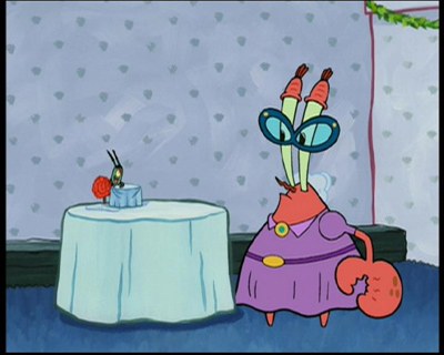 Recht witzige Folge, die ihren Humor vor allen Dingen aus dem Irrwitz bezieht, dass ein winziger Einzeller eine Beziehung mit einer Krabbe anfangen könnte. Ansonsten ist auch das eine reine Mr. Krabs und Plankton Folge, in der Spongebob nur eine Gastrolle innehat.