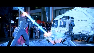 Klingt alles nach recht viel Story, doch letztendlich bedient sich der Film an den üblichen Klischees und Zutaten für einen Zielgruppenorientierten Mainstreamfilm. Da gibt es die Helden, die eigentlich keine sein wollen, den üblichen Herzschmerz zwischen einem alten Paar und wiedergefundener Liebe und dem Konflikt mit Bens Aussehen. Dazu noch ein knallbuntes Setting, knall-bumm Effekte und Nu Metal Soundtrack. Alles wird dabei flott erzählt, ohne dass das Publikum großartig nachdenken muss. Die Darsteller werden ebenfalls nicht sonderlich gefordert und bedienen weitere Klischees. Die Alba sieht hübsch aus und mehr brauch sie auch nicht, Chris Evans als Johnny Storm reist einen gelungen One-Timer nach dem anderen und Michael Chiklis als Ben Grimm spielt den gebrochenen Mann der seine Frau verliert. Man darf den Film einfach nicht ernstnehmen und wer hier eine ernsthafte Comicverfilmung erwartet, ist hier garantiert falsch. Hier zählt einfach nur Hirn aus und überhaupt nicht über das gesehene Nachdenken. Sollte man dennoch in die Versuchung kommen, erwarten euch dabei einige wirklich üble Logikfehler. Beispiel? In der Brooklyn Bright Szene, wollen die Fantastischen Vier durch eine Polizeisperre und bitten Sue sich unsichtbar zu machen und sich so durchzuschmuggeln. Eigentlich logisch, zumindest bis zur nächsten Szene, wo die anderen schon mit den Klamotten von Sue hinter der Absperrung warten. Ah ja! Leider wird auch Chris Evans in meinen Augen teilweise etwas ausgebremst, da er hätte mehr Witze reisen können. Etwas bessere Dialoge hätten ebenfalls nicht geschadet, denn diese befinden sich auf ziemlich durchschnittlichen Niveau. Während die Effekte auf der DVD noch ziemlich gut aussahen, verhindert die hohe Auflösung der Blu-ray den WOW Effekt leider deutlich. Die CGI Effekte sind ziemlich aufdringlich und sehen teilweise ein wenig billig aus. Schön fand ich allerdings, dass Das Ding in einem Gummikostüm rumläuft und nicht aus Computereffekten besteht. Dies gibt zusätzliche Punkte in Sachen Charme.