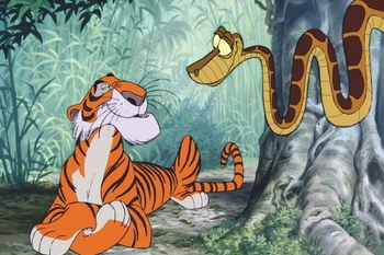 Wie bereits erwähnt, basiert der Disney Film nur sehr lose auf den Erzählungen von Rudyard Kipling. Dies liegt wohl vor allem daran, dass die Vorlage sehr düster ist, während sich Disney eher ein Feel Good Movie vorstellte. So lebt Mogli friedlich und ohne Probleme beim Wolfsruddel und alle Tiere haben sich lieb. Unruhe ins Leben bringt erst der Tiger Shir Khan, der sich wieder in den örtlichen Dschungel verirrt hat. Daraufhin beschließen die Wölfe und der Panther Baghira das Mogli wieder zu den Menschen soll. Mogli hat darauf aber so gar keine Lust und sträubt sich vehement dagegen und findet in den Bären Balu auch einen Freund, der ihn im Dschungelleben unterstützen soll. Dabei geraten beide natürlich in so einige Abenteuer und landen u.a. in den Fängen von Affenkönig King Louie. Und Shir Khan treibt sich ebenfalls noch rum...