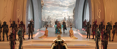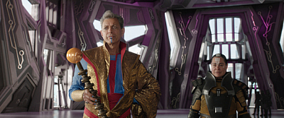 Zwar geht es im Prinzip um den Untergang von Asgard, doch wirklich bedrohlich und ernst wird dies nicht gerade inszeniert. Schon der Auftakt zwischen Thor und Surtur ist an Selbstironie kaum zu überbieten und zeigt wohin die Reise in “Tag der Entscheidung” geht. Weiter geht es zu Szenen, wo diverse Cameos die Geschichte rund um Thor in einem Theaterstück Revue passieren lassen und mündet schließlich auf dem bunten Müllplaneten Sakaar, welcher vom völlig überdrehten Grandmaster (Jeff Goldblum) beherrscht wird, welcher sich den Tag mit Gladiatoren kämpfen versüßt. Hier kommt es dann auch zum brachialen Kampf zwischen Thor und Hulk, welcher sehr ansehnlich inszeniert daherkommt. Die Gagdichte ist enorm und steckt sogar ein “Guardian of the galaxy Vol. 2” locker in die Tasche. Im Gegensatz zum zweiten Teil rund um die Guardians kommt Thors Ausflug jedoch in sich gelungener daher. Besonders die Frotzeleien zwischen Thor und Hulk sind mal wieder erstklassig und erinnern an ein altes Ehepaar, aber auch sonst ist niemand sicher vor einem Gag.