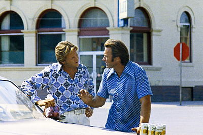 Roadmovies sind die konsequente Weiterführung des Westerns und wohl eines der amerikanisten Genre. Es geht um Freiheit, Selbstfindung und die Straße als Sinnbild für den Lebensweg. In den wirren des Vietnamkrieges sprossen etliche solcher Roadmovies aus dem Boden. Angefangen von Klassikern wie “Easy Rider” und “Fluchtpunkt San Francisco” über das Regiedebüt “Duell” von Steven Spielberg und Sam Peckinpahs grandiosen “The Gateway”. In die “Die letzten beissen die Hunde” kreuzen sich sprichwörtlich die Wege von Thunderbolt (Eastwood) und Lightfood (Bridges). Während sich der Taugenichts Lightfood von einem Kleinverbrechen zum nächsten hangelt, ist Thunderbolt bereits ein berüchtigter Bankräuber, der mit neuer Identität nur darauf wartet, die Beute seines letzten Raubzuges aus seinem Versteck zu fischen. Während Thunderbolt anfangs kein großes Interesse an einer Partnerschaft hat, lässt Lightfood jedoch nicht locker und beide freunden sich doch noch zunehmends an. Obwohl der Film im Prinzip nur mit Eastwood vermarktet wurde, ist Bridges im Film gleichwertig in Szene gesetzt und bekommt die gleiche Srceentime zugesprochen. Dies ist sehr zuträglich für die Chemie zwischen den Beiden, welche von der ersten Sekunde an stimmt. Während Bridges eher für die Leichtfüßigkeit und die Gags verantwortlich ist, gibt Eastwood eher den wortkargen, wenngleich er nie in in die Rollen seiner Westernausflüge oder “Dirty Harry” fällt.