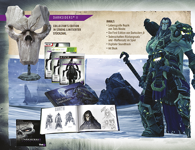 Die Darksiders II Collector’s Edition enthält die bereits angekündigte First Edition von Darksiders II (das gilt ausschließlich für den deutschsprachigen Raum) sowie eine lebensgroße Replik von Tods Maske inkl. passendem Sockel. Neben dem digitalen Soundtrack und einem Art Book im Hardcover komplettieren Download-Codes (DLC) für den Todesschatten-Rüstungssatz sowie den Todesschatten-Waffensatz die Box. Vorbesteller können sich die streng limitierte Collector’s Edition vorab zu einem Preis von ca. 100 € für PS3 und Xbox 360 bzw. ca. 80 € für PC sichern.