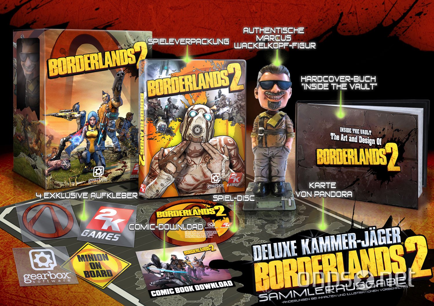 Die Deluxe Kammerjäger (Sammlerausgabe) enthält eine Version von Borderlands 2, einen authentischen Marcus Kincaid-Wackelkopf, eine Hardcover-Ausgabe von Inside the Vault: The Art & Design of Borderlands 2, einen Satz Sammelsticker, eine Karte von Pandora, einen Download-Code für einen digitalen Comic und digitale Bonus-Spielinhalte zum Herunterladen. Die Ultimative Beutekiste (Limitierte Ausgabe) enthält alle oben genannten Gegenstände und dazu noch eine maßstabsgetreue Replik der roten Truhen, die man in Borderlands 2 in ganz Pandora finden kann, eine Steelbook-Hülle, eine Übersicht über alle Kreaturen in Pandora im Großformat, einen Satz lithographischer Postkarten, Feldnotizen von Sir Hammerlock, eine Stoffkarte von Pandora und ein nummeriertes Echtheitszertifikat. Beide Spezialeditionen erscheinen für das Xbox 360 Videospiel- und Entertainment-System von Microsoft, das PlayStation 3 Computer-Entertainment-System und Windows-PC. Die Preise liegen je Plattform zwischen 70 Euro und 90 Euro für die Deluxe Kammerjäger Sammlerausgabe sowie 110 Euro und 130 Euro für die limitierte Ultimative Beutekiste.