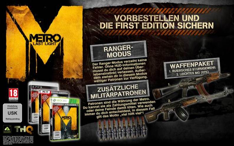 Die komplette Erstauflage von Metro: Last Light erscheint exklusiv in Deutschland, Österreich und der Schweiz als limitierte „First Edition“.
