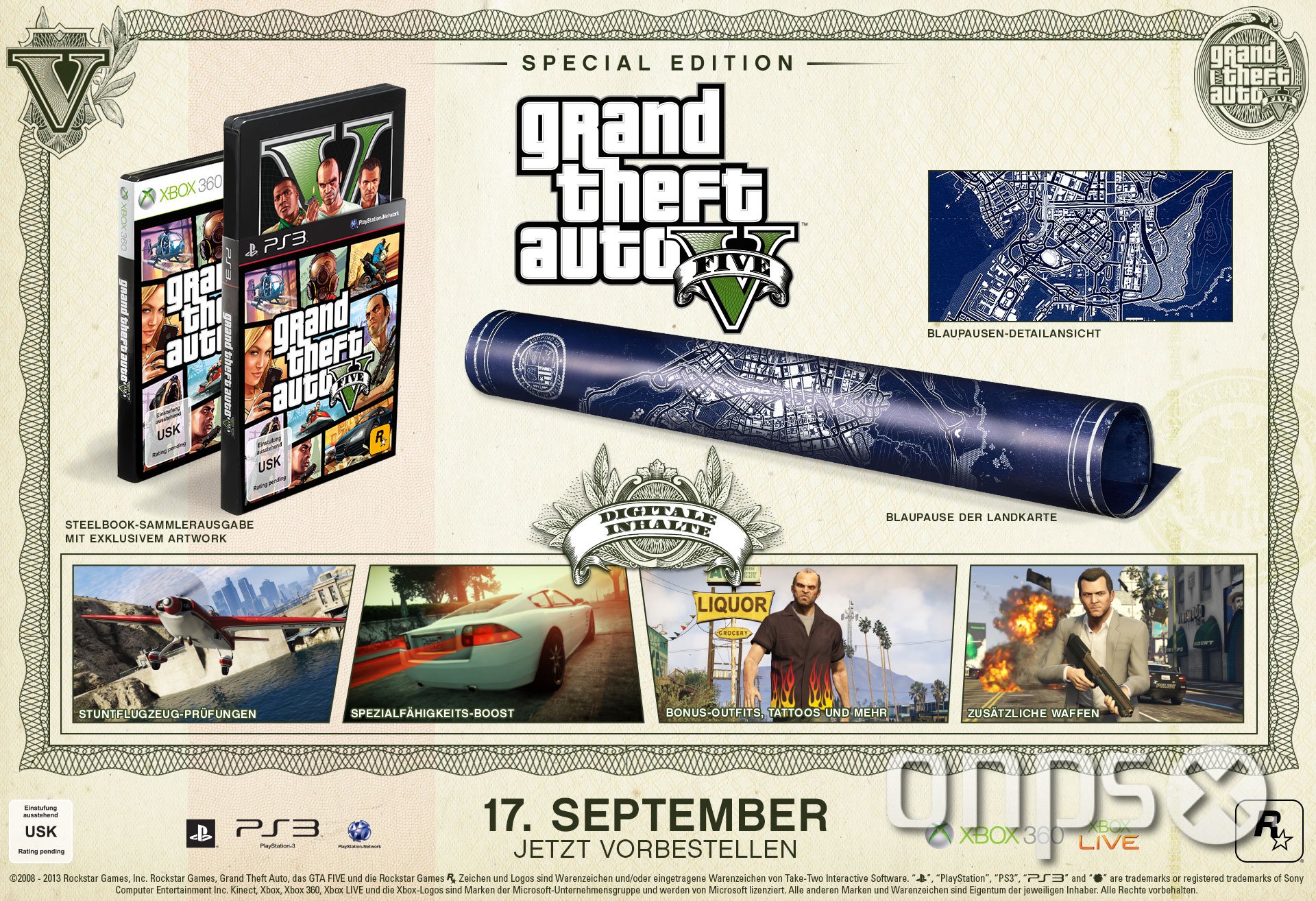 Die Grand Theft Auto V Collector’s Edition und die Grand Theft Auto V Special Edition mit speziellen digitalen Inhalten und exklusiven physischen Gegenständen zu Grand Theft Auto V sind perfekt dazu geeignet, die Rückkehr dieser umjubelten Spielereihe zu feiern. Die Grand Theft Auto V Collector’s Edition wird für 129,99 € (UVP), die Grand Theft Auto V Special Edition für 79,99 € (UVP) erhältlich sein.