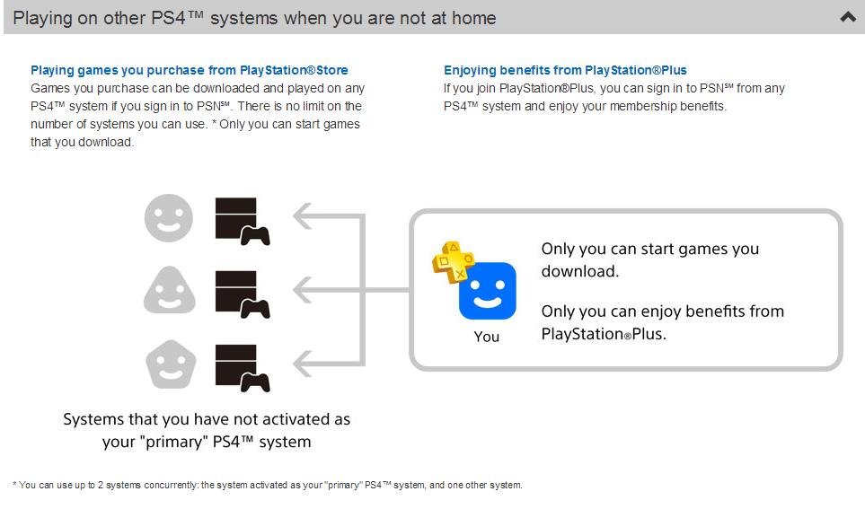 Nun kann man seinen Account auch auf unbegrenzt vielen anderen PS4 Konsolen einrichten, aber: Es kann dann nur dieser Account auf geteilte Inhalte zugreifen (bei der PS3 können auch andere Accounts auf dem System darauf zugreifen -> ähnlich wie beim Hauptsystem der PS4) und man muss beim PSN angemeldet sein und es können nur zwei PS4 Konsolen (inkl. Hauptsystem) gleichzetig online sein.