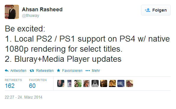 Der normalerweise recht akurate Insider Ahsan Rasheed hat per twitter mal wieder mitgeteilt, was bei Sony momentan so in Arbeit sei. Demnach arbeite Sony an PS1 und PS2 Support auf der PS4, womit manche Titel sogar in echten 1080p auf der PS4 laufen sollen. Eine ähnliche Meldung hatte Eurogamer bereits vor längerer Zeit verbreitet. Laut Rasheed sei die Software aber zum aktuellen Zeitpunkt noch recht fehlerhaft und nicht alle Titel würden funktionieren. Außerdem soll an Blu-Ray und Media Updates gearbeitet werden, womit wohl unter anderem die Unterstützung für Bilder und Musik gemeint ist.