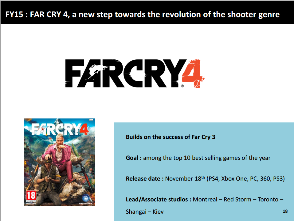 Oops - im aktuellen Geschäftsbericht lässt Ubisoft durchsickern, dass man am 18. November (USA) und 20. November (Europa) diesen Jahres Far Cry 4 für PS4 und PS3 veröffentlichen will. Das Spiel dürfte tatsächlich im Himalaja (wie gemutmaßt wurde) angesiedelt sein, einen aussergewöhnlichen Schurken bieten und von tausenden Mitarbeitern aus den Studios Montreal, Redstorm, Toronto, Shanghai und Kiew zusammenprogrammiert werden.