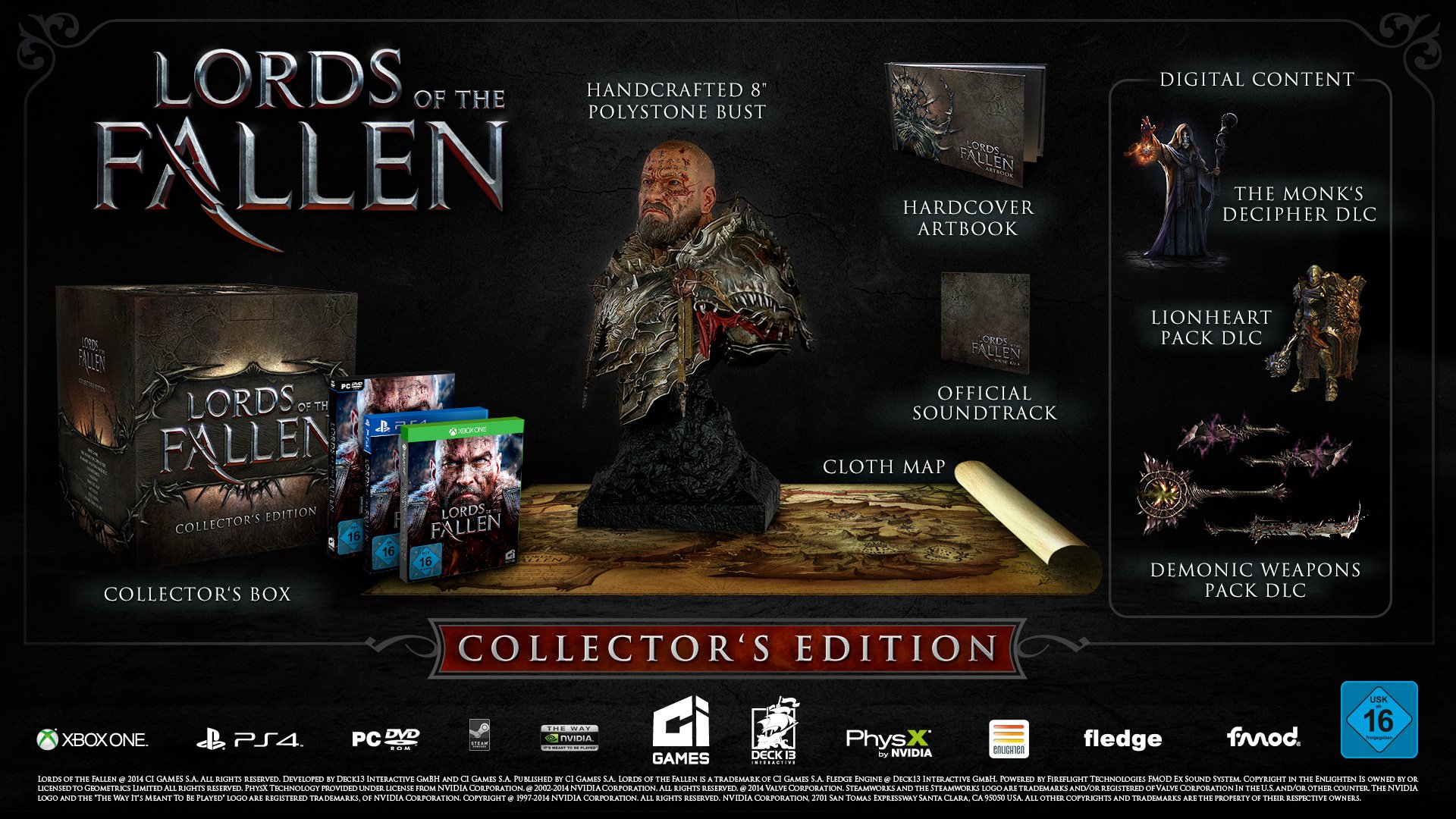 Dem schwer gezeichneten Protagonisten von Lords of the Fallen, Harkyn, wird mit der umfangreichen Collector’s Edition ein Denkmal gesetzt. Über 20 cm misst die handgefertigte Polystein-Büste, die das schwer gezeichnete Antlitz des raubeinigen Helden zeigt. Neben der detailreichen Sammelfigur enthält die Collector’s Box die faszinierende Stimmung von Lords of the Fallen, eingefangen in einem epischen Soundtrack aus der Feder des prämierten norwegischen Komponisten Knut Avenstroup Haugen. Zusätzlich befindet sich ein umfangreiches Hardcover-Artbook mit Konzeptzeichnungen, Artworks und Hintergrundinformationen sowie eine Übersichtskarte der Welt von Lords of the Fallen aus Stoff in der Box.