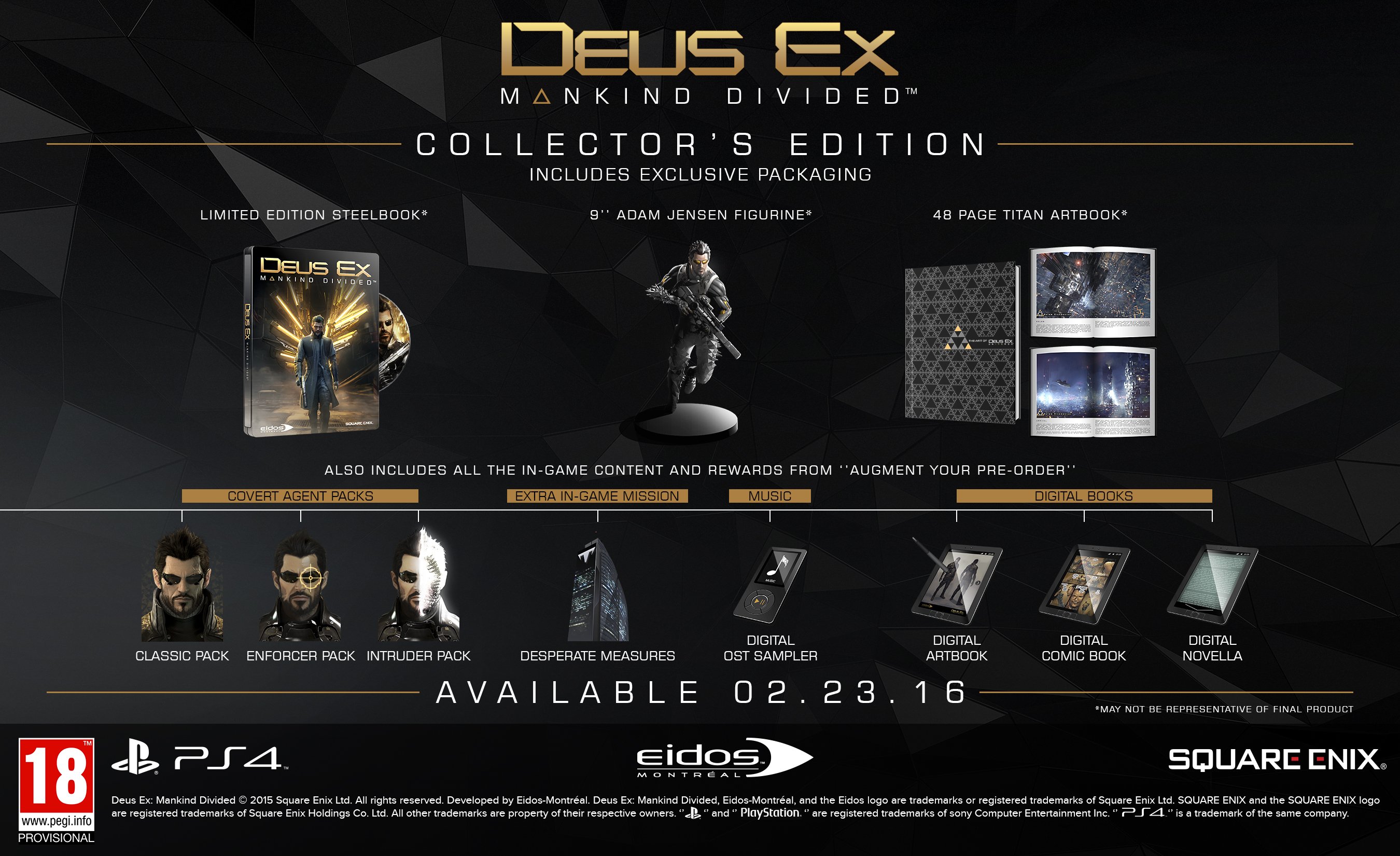 Zudem dürfen sich Fans darüber freuen, dass die von der Community zusammengestellte Collector’s Edition des Spiels ebenfalls in Kürze vorbestellt werden kann. Zusätzlich zu einem umfassenden DLC-Paket wird diese limitierte Edition auch ein 48-seitiges Artbook von Titan, eine 23cm große Adam Jensen Figur, sowie das exklusive Steelbook enthalten sein. Detaillierte Informationen zum Inhalt und zu den Vorbesteller-Links dieser Version werden ebenfalls in Kürze bekannt gegeben.