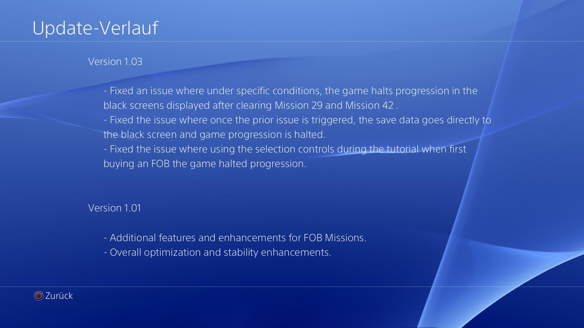 Ab sofort ist Update 1.03 für Metal Gear Solid V: The Phantom Pain verfügbar und behebt das Problem, dass Spielstände zerstören konnte. Denn wer Mission 29 oder 42 mit Quiet als Begleiter ausführte, konnte seinen Spielstand verlieren. Doch mit diesem Update sollte das Problem Geschichte sein.