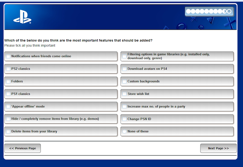 Gerade erst ist Firmware 3.0 für die PlayStation 4 erschienen und im Hintergrund laufen natürlich bereits die Vorbereitungen für die nächsten Updates. Nun hat Sony aber an ein paar ausgewählte Spieler eine Umfrage geschickt, in der man sich Anregungen und Wünsche holen möchte. Meist konnten die Teilnehmer frei ihre Wünsche äußern, doch am Ende gab es auch ein paar Wahlmöglichkeiten mit möglichen Features.