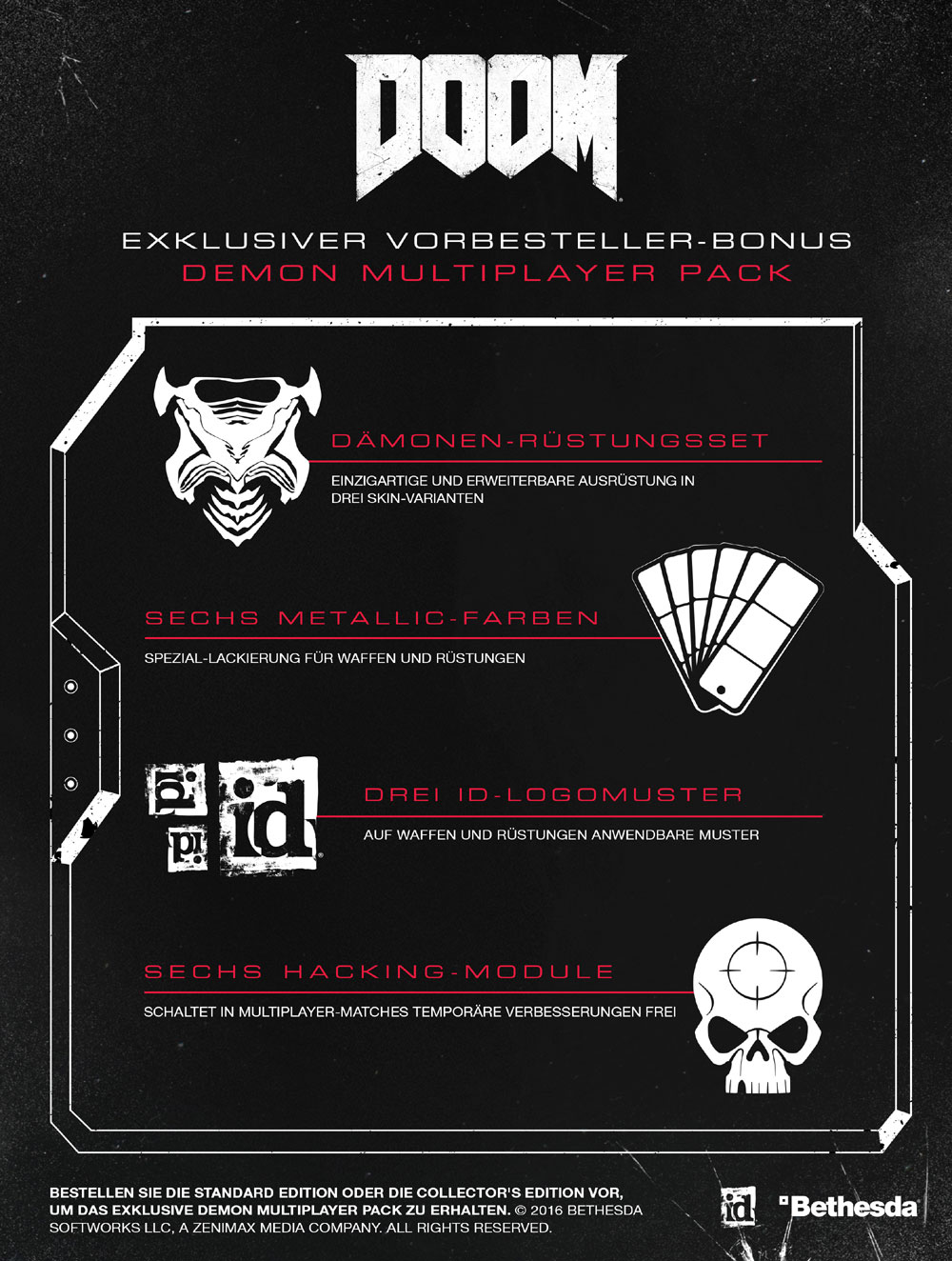 Die DOOM Collector's Edition kann bei ausgewählten Händlern vorbestellt werden. Vorbesteller der DOOM Collector's Edition oder der Standardversion des Spiels erhalten das Demon Multiplayer Pack mit einem speziellen Dämonen-Rüstungsset in drei Skin-Varianten, sechs Metallic-Farben, drei id-Logomustern für Waffen und Rüstung sowie sechs Hacking-Modulen – temporäre Verbesserungen, die Ihnen einen Vorteil in Multiplayer-Matches verschaffen können.