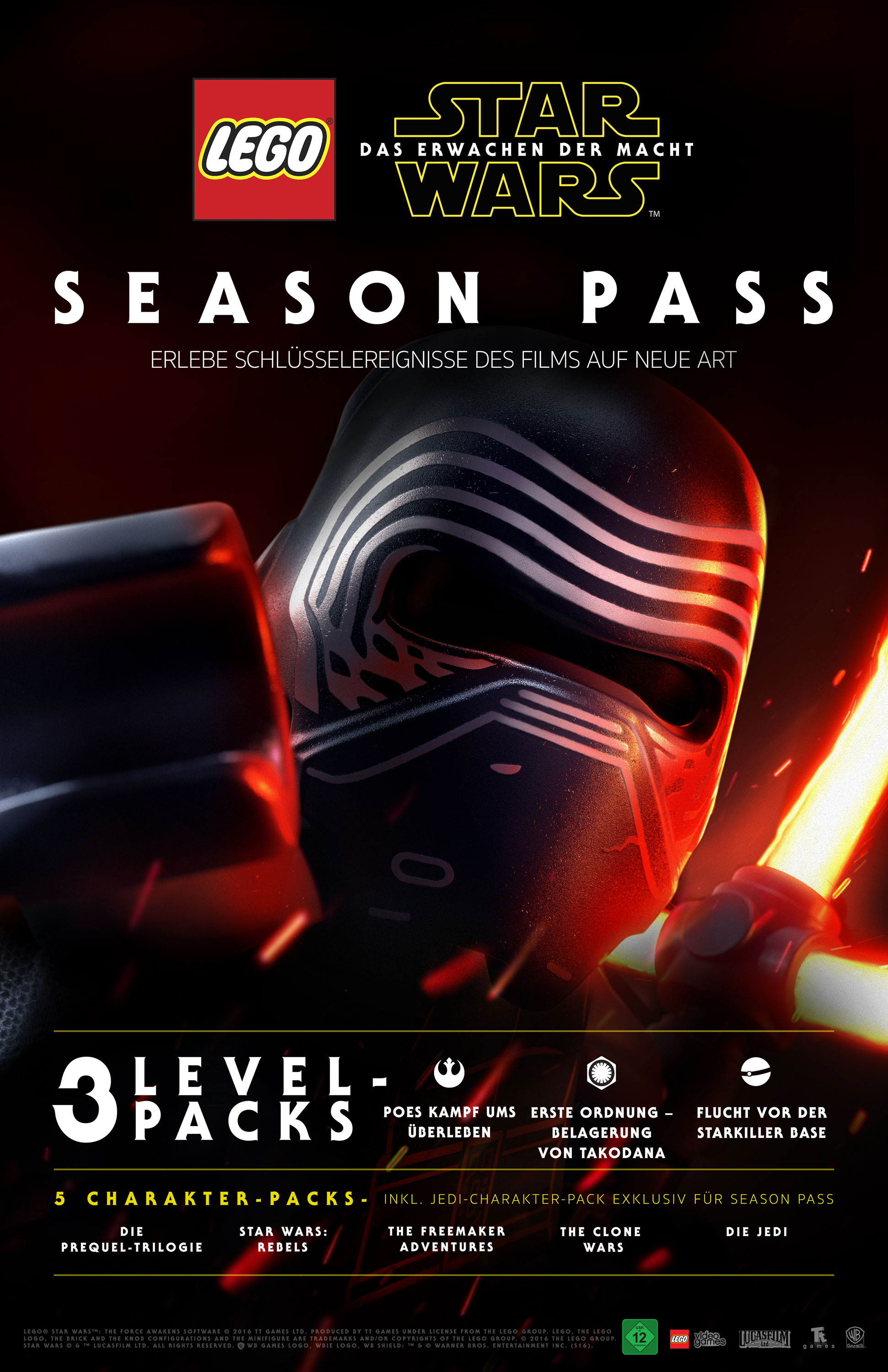 Der Season Pass umfasst drei brandneue Level Packs, die das LEGO Star Wars: Das Erwachen der Macht-Abenteuer mit aufregenden, neuen Inhalten erweitern, die im Film nicht zu sehen waren. Jedes Erweiterungspaket lässt die Spieler Schlüsselelemente aus dem Film auf neue Weise erleben. Zum Beispiel Poe Damerons Reise zurück zur Basis des Widerstands nach dem Absturz auf Jakku, den Angriff auf Maz Kanatas Schloss durch die Augen von Kylo Ren und die Vernichtung der Starkiller-Basis aus der Perspektive zweier Piloten des Widerstands. Der Season Pass enthält zudem fünf Character Packs mit bekannten Star Wars-Helden, -Schurken und Droiden.