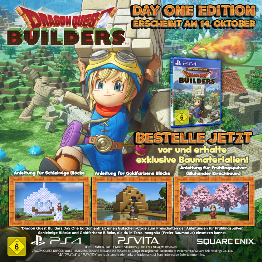 Square Enix wird Dragon Quest Builders am 14. Oktober in Europa in einer besonderen Day-One-Edition erscheint. Käufer erhalten eine Auswahl an exklusiven Bau-Anleitungen für Gegenstände im Spiel, die wiederum die Herstellung von Materialien in Terra Incognita (Freier Baumodus) ermöglichen.