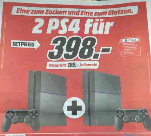 Laut Media Markt Prospekt wird es ab Mittwoch, dem 07. September, ein ganz besonderes Angebot geben. Wer zwei PlayStation 4 Konsolen kauft, zahlt nämlich nur 398€ was 199€ pro Konsole entspricht! Viel günstiger dürfte man in naher Zukunft wohl nicht an eine PS4 rankommen.