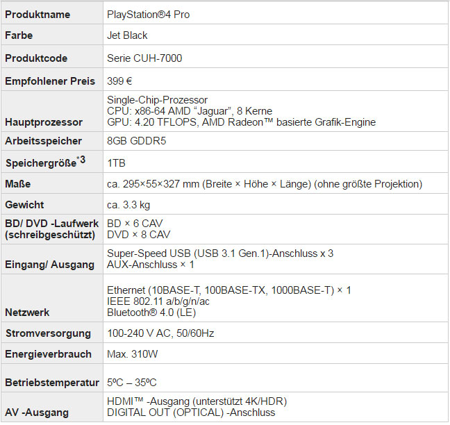 Die Einführung von PS4 Pro, die neben dem Standard PS4-Modell angeboten wird, bietet den Verbrauchern mehr Auswahlmöglichkeiten. Benutzer können jedes PS4 Spiel sowohl auf PS4 Pro oder der Standard PS4 spielen, die vor kurzem in einem schlankeren Design zum unverbindlichen Verkaufspreis von 299€ veröffentlicht wurde. Das ebenfalls jüngst veröffentlichte PlayStation VR System ist mit beiden Modellen kompatibel. PS4 Pro und die Standard-PS4 haben die gleiche Benutzeroberfläche und ermöglichen Zugriff auf dieselbe lebendige Online-Community. PlayStation-Spieler haben nun die Möglichkeit ihre Konsole auf Basis ihrer Bedürfnisse und Vorlieben auswählen.