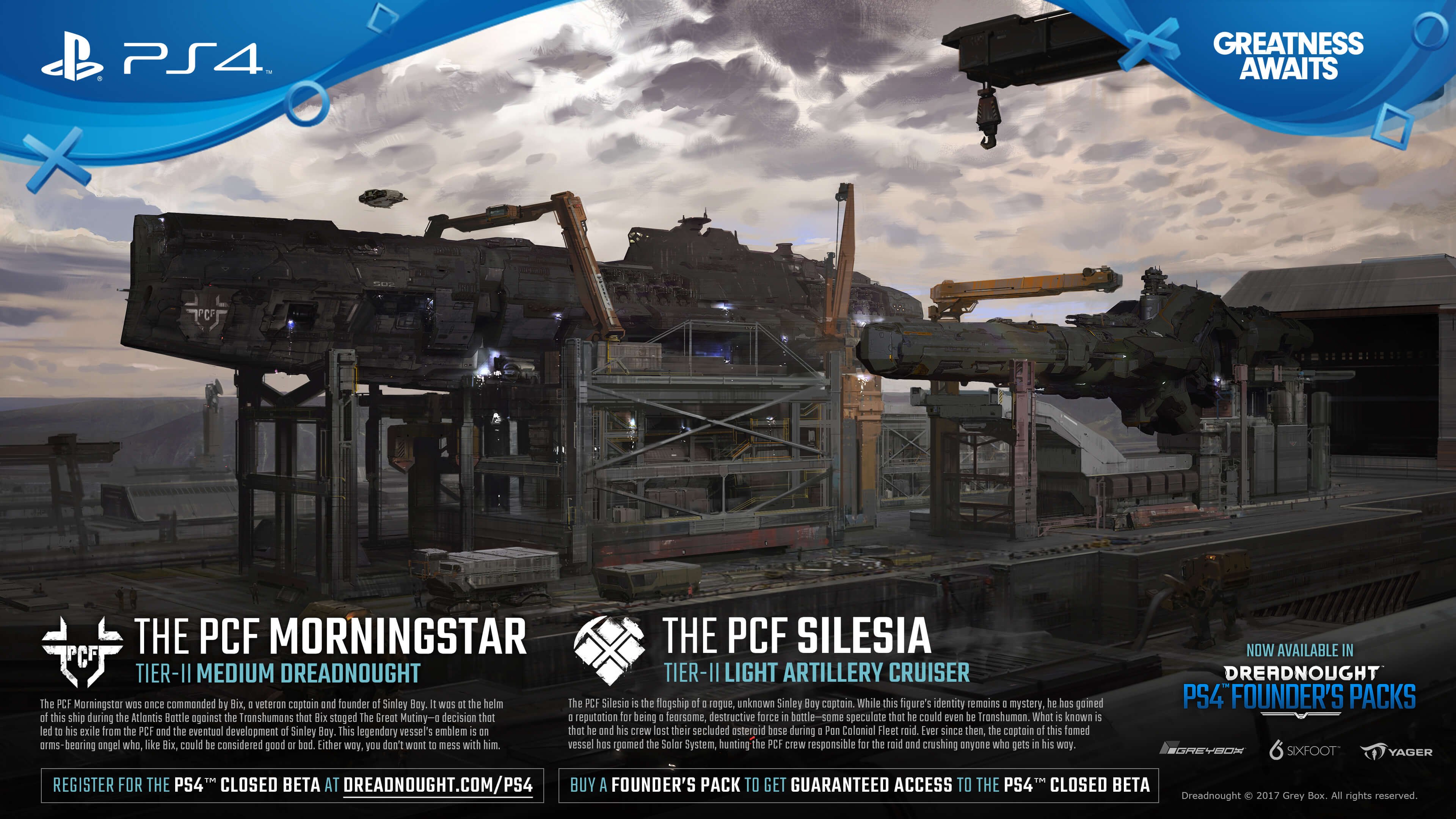 Die Registrierung für die geschlossene Beta von Dreadnought auf der PS4 ist über: www.greybox.com/dreadnought/ps4 möglich. Sofortigen Zugang zur geschlossenen Beta gibt es mit dem Kauf eines Dreadnought Founder’s Packs, die seit heute im PlayStation Store zu haben sind: