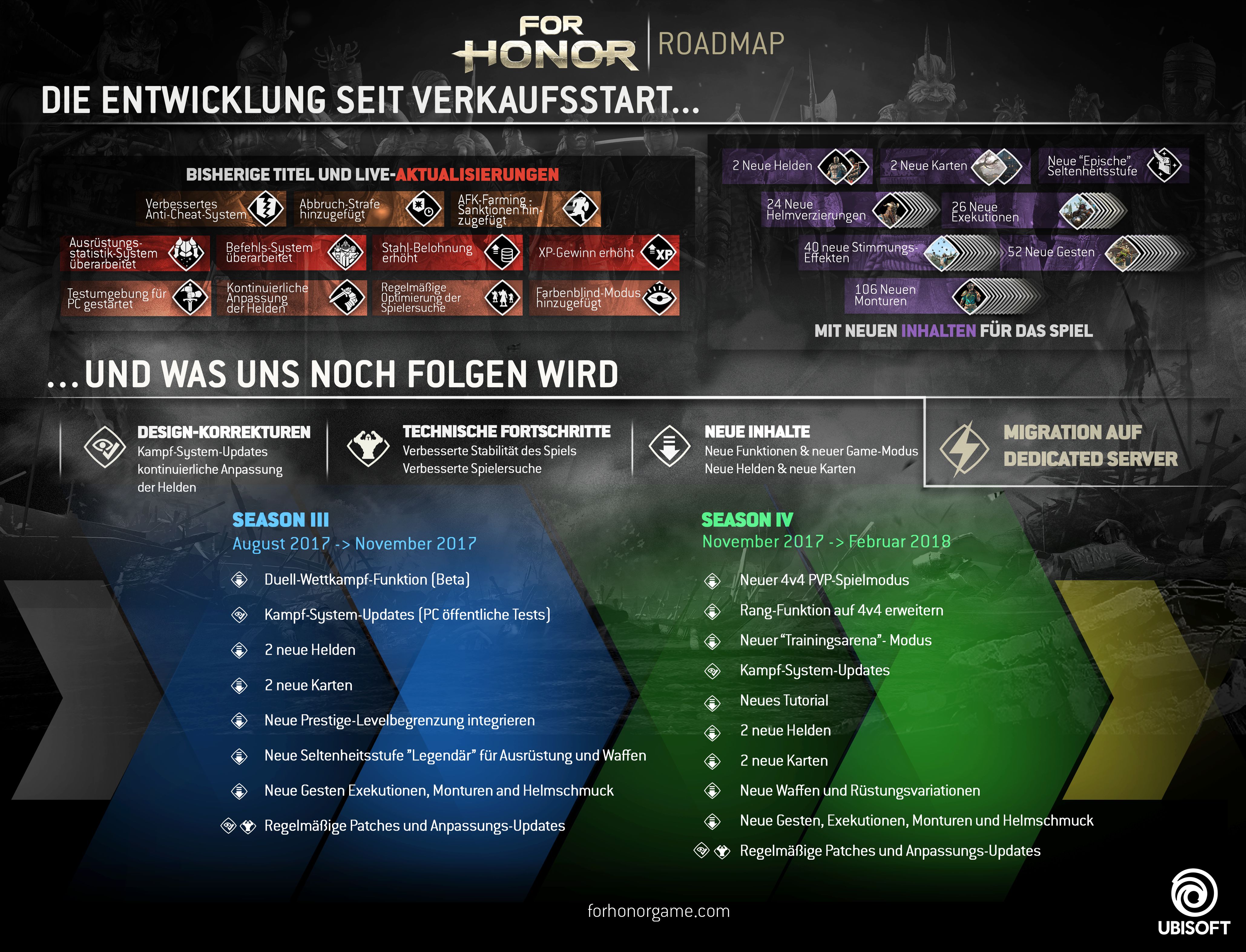 For Honor sorgte vor Veröffentlichung für viel Aufsehen, doch nach dem Release interessiert sich fast niemand mehr für diese Service Game Klopperei. Ubisoft kündigte deshalb einen Entwicklungsplan für For Honor bis 2018 an, der für den Rest des Jahres regelmäßig neue Inhalte bieten und das gesamte Spielerlebnis verbessern wird. Neben der zukünftigen Einführung von dedizierten Servern steht im Mittelpunkt des Plans die Veröffentlichung von zwei Seasons im Jahr 2017. Zusätzlich zu den Hauptveröffentlichungen wird For Honor durch reguläre Updates weiterentwickelt, bei denen das Feedback der Community berücksichtigt wird.