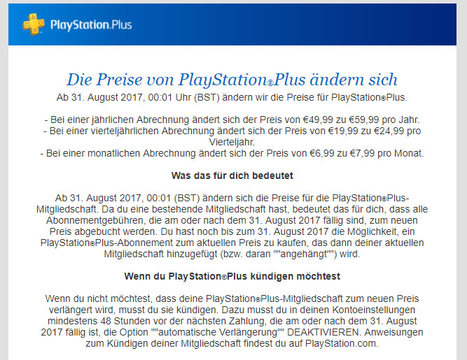 Überraschung im E-Mail Postfach. Sony langt mal wieder kräftig zu, ohne einen echten Mehrwert zu bieten. Um auch in Zukunft weiter auf der PlayStation 4 online spielen zu wollen, muss man ab dem 31. August 2017 noch tiefer in die Tasche greifen. Das PlayStation Plus Abo verteuert sich für 12 Monate um 10€ auf nunmehr 59,99€ pro Jahr. Pro Quartal werden dann 24,99€ (statt 19,99€) fällig und selbst pro Monat darf man nun 1€ mehr zahlen - nämlich 7,99€ (statt 6,99€).