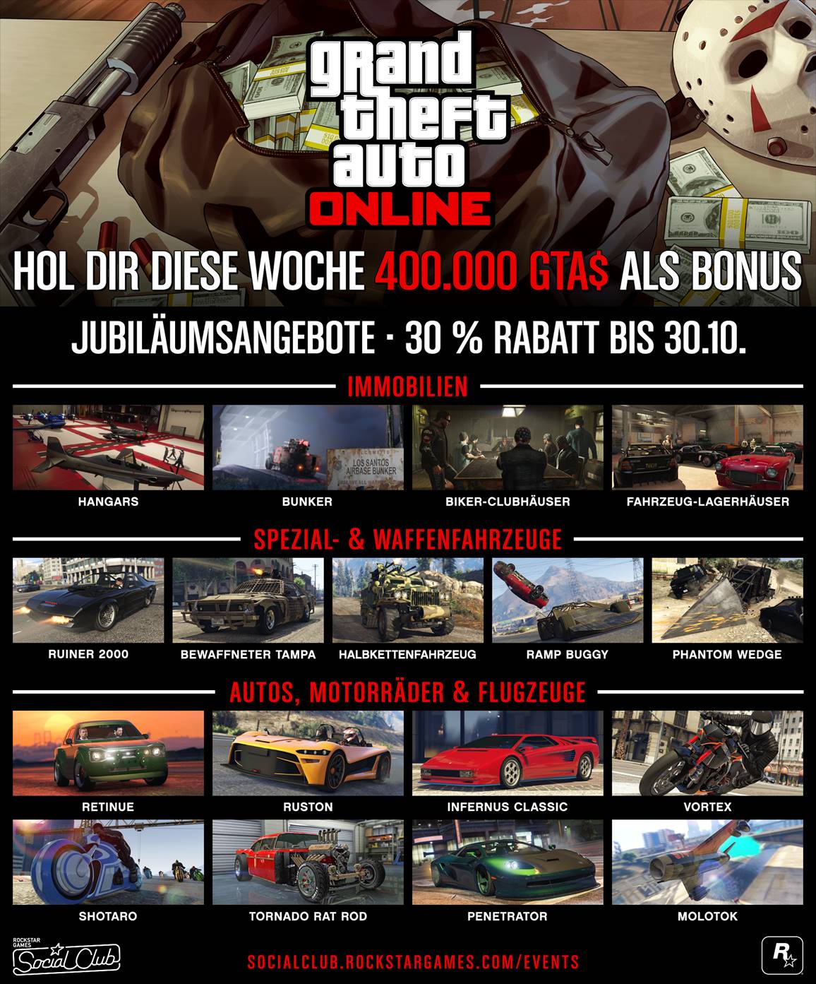 Als Teil der Vierjahresfeier von GTA Online gibt es an diesem Wochenende zudem eine ungeheuerliche Auswahl an rabattierten Artikeln – von Hangars, über Biker-Clubhäuser, Bunker und Fahrzeug-Lagerhäuser bis hin zu ausgewählten Supersportwagen, Motorrädern wie der Shotaro (denkt dran, Deadline zu spielen, um dieses Motorrad freizuschalten!), Spezialfahrzeugen und Waffenfahrzeugen. Alle diese Dinge sind bis zum 30. Oktober im Angebot.