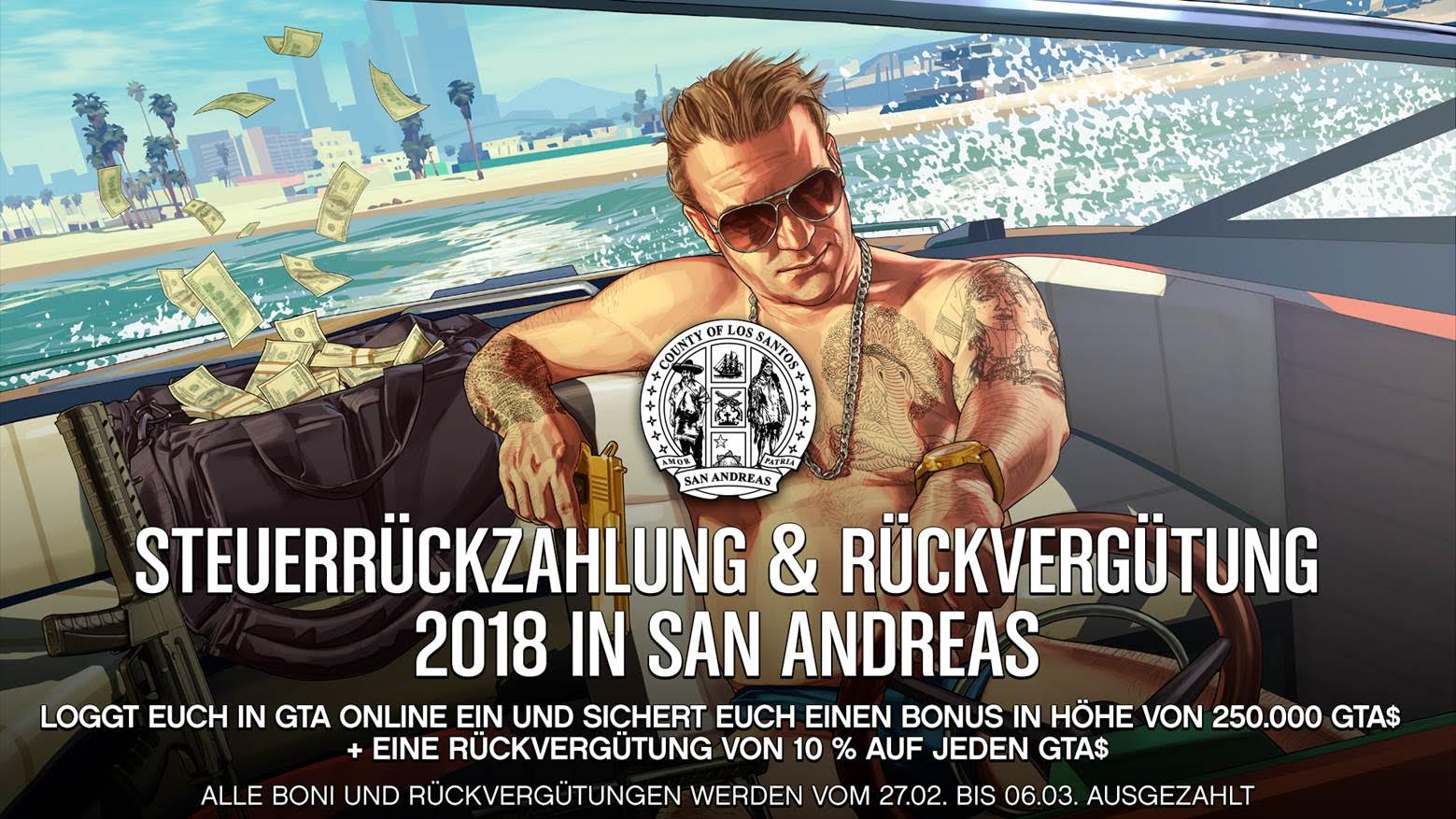 Rockstar Games weiß, wie man seine Spieler erfreuen kann. Nachdem die In-Game Preise in GTA Online stetig nach oben stiegen, gibt es zumindest demnächst etwas zurück: Loggt euch einfach zu einem beliebigen Zeitpunkt zwischen dem 16. und 26. Februar in GTA Online ein, um euch für den Bonus von 250.000 GTA$ zu qualifizieren. Außerdem bekommt ihr für jeden GTA$, den ihr zwischen dem 16. und 26. Februar ausgebt, eine Rückvergütung in Höhe von 10 % – bis zu einer Gesamtsumme von 1.000.000 GTA$. Loggt euch dann ab dem 27. Februar wieder ein, um euren Bonus und eure Rückvergütung zu bekommen.