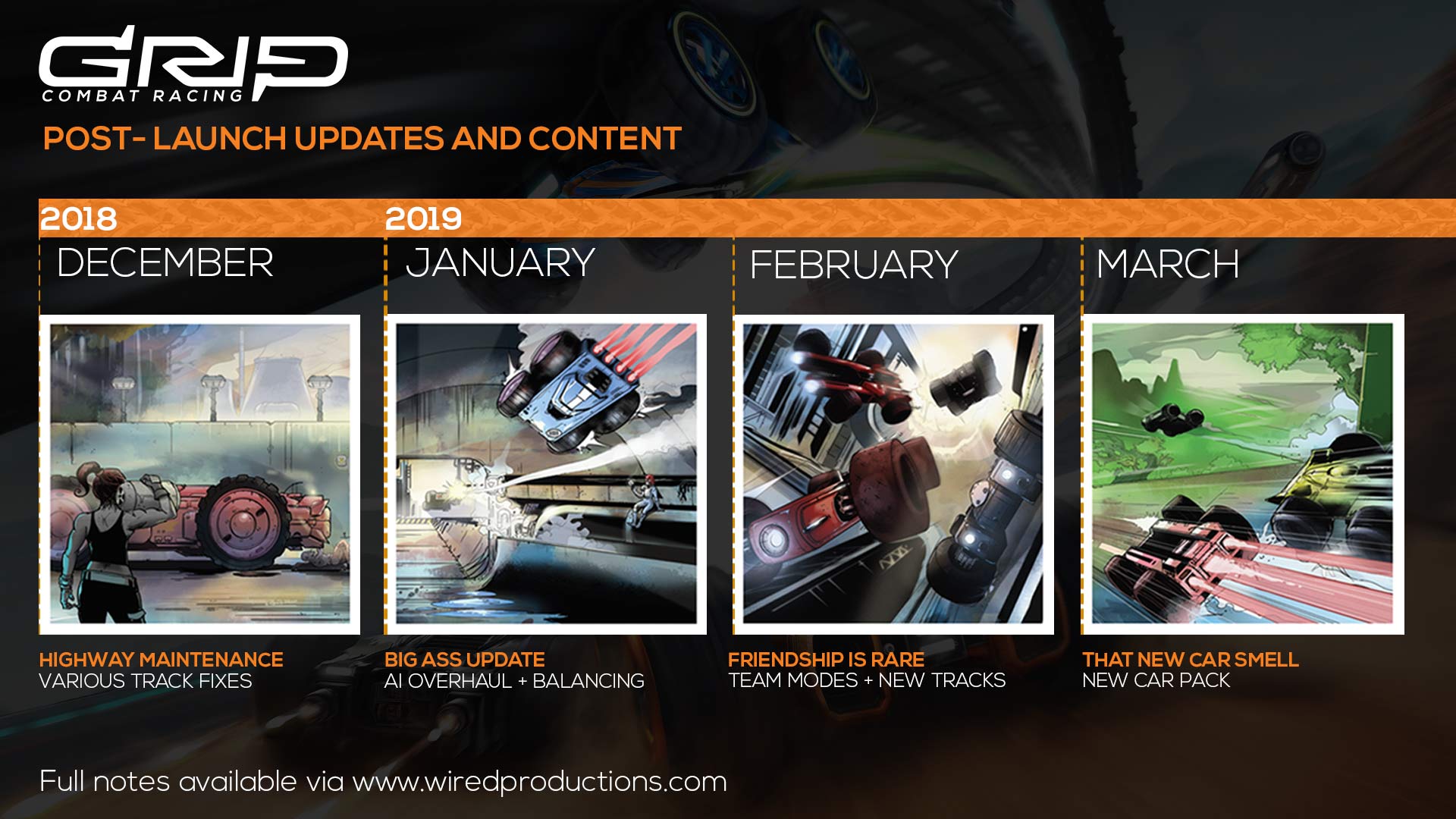 Nach dem Launch auf der PS4 schildert die Timeline einige kommende Balancing-Verbesserungen, neue Strecken und Modi. Diese sollen dazu beitragen, GRIP: Combat Racing weiterhin aufregend und den kompetitiven Charakter aufrecht zu erhalten. Zusätzlich zur Roadmap wird GRIP: Combat Racing im Jahr 2019 mit einer eigenen Race Series den letzten Schritt in Richtung Wettkampf gehen. Alle Details zu regionalen Events und Partnerschaften folgen im neuen Jahr.