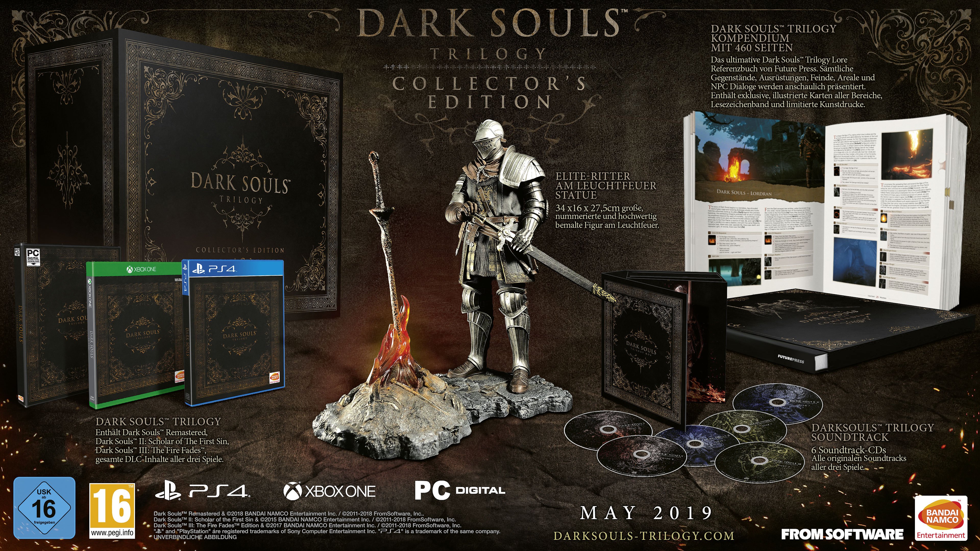 - Das 460-seitige Dark Souls: Trilogy Kompendium – welches illustrierte Karten mit den Positionen der Boss-Gegner und NPCs, eine Item-Enzyklopädie, ein Bestiarium aller Feinde und Boss-Gegner und ein Manuskript aller sich wiederholenden Dialoge beinhaltet (das der CE beiliegende Kompendium wird in englischer Sprache sein)