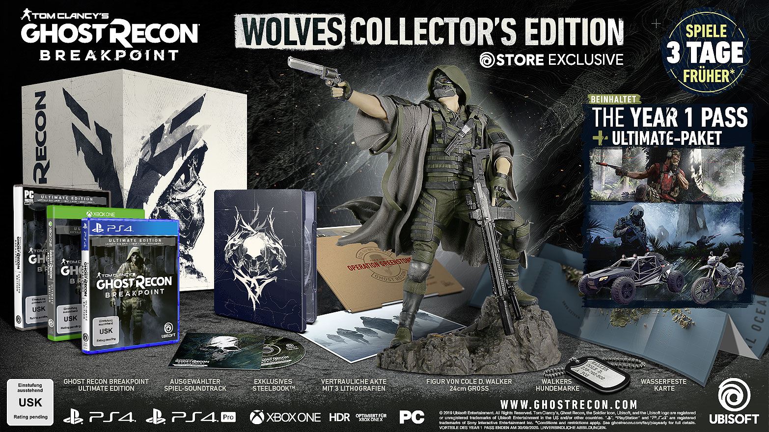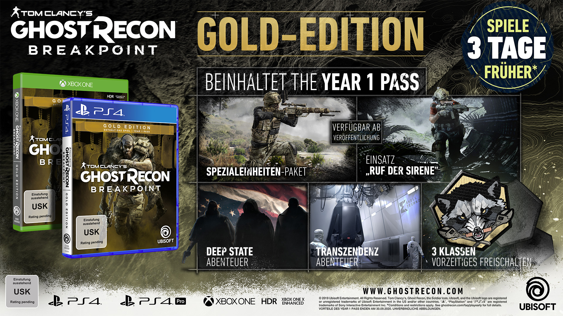 Käufer der Gold, Ultimate oder Collector’s Edition erhalten bis zu drei Tage früher Zugang zum Spiel. Fans, die Tom Clancy's Ghost Recon Breakpoint vorbestellen, erhalten Zugang zur Ghost Recon Breakpoint Beta kurz vor dem Start sowie zum Sentinel Corp. Paket, das exklusive Ausrüstung enthält.