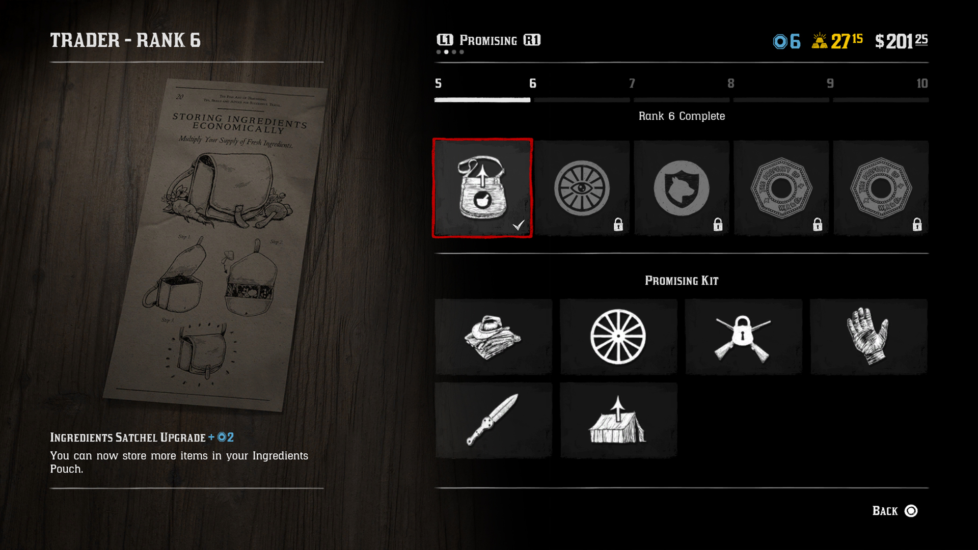 Beispielsweise gewährt euch die angehende Ausrüstung des Händlers Zugriff auf sieben Gegenstände, darunter einen einzigartigen Sattel, Waffengürtel und den Suppentopf, der euer Lager mit Essen versorgt, das eure Kerne oder die eures Trupps auffüllt (sowie zusätzliche Rezepte für Spezialeintöpfe, die goldene Kerne verleihen). Die etablierte Ausrüstung des Kopfgeldjägers wiederum gewährt Zugriff auf sieben Gegenstände, darunter einen Gefängniswagen zur Aufbewahrung mehrerer Zielpersonen, Bolas als Wurfwaffe, in der sich die Beine der Zielpersonen verheddern, neue Bekleidung und mehr.