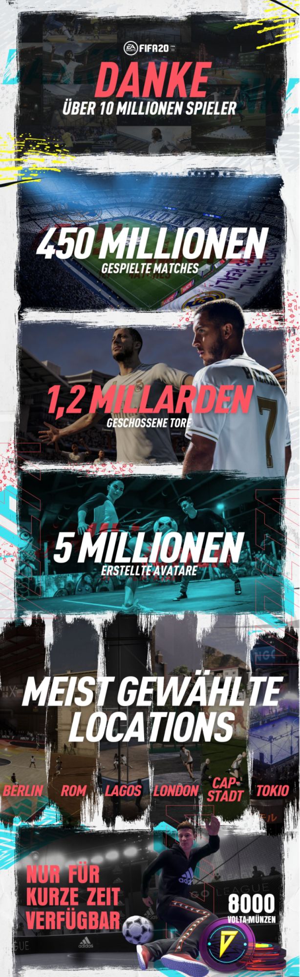 Seit dem Start von FIFA 20 kommen immer mehr Spieler ins Spiel. Über 10 Millionen treten bereits auf professionellen Plätzen und in Futsal-Käfigen auf der ganzen Welt gegeneinander an. Um das zu feiern erhalten alle Spieler, die bis zum 17. Oktober ins Spiel gehen 8.000 Volta-Münzen, um ihre Avatare zu personalisieren und ihren Style mit den neuesten Items des aktuellsten Volta-Drops auszudrücken. Außerdem können die Spieler das neue Volta Football Squad Building Challenge Puzzle lösen um weitere in-game Belohnungen zu erhalten.