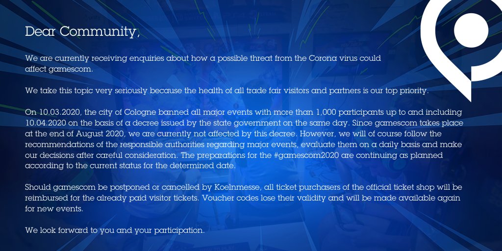 Die Stadt Köln hat am 10.03.2020 auf Basis des Erlasses der NRW-Landesregierung vom selben Tag alle Großveranstaltungen mit mehr als 1.000 Teilnehmern bis einschließlich 10.04.2020 untersagt. Da die gamescom Ende August 2020 stattfindet, sind wir aktuell von diesem Erlass nicht betroffen. Wir werden die Empfehlungen der zuständigen Behörden bezüglich Großveranstaltungen aber natürlich verfolgen, tagesaktuell bewerten und unsere Entscheidungen nach sorgfältiger Abwägung treffen. Die Vorbereitungen für die #gamescom2020 laufen nach aktuellem Stand für den festgelegten Termin planmäßig weiter.