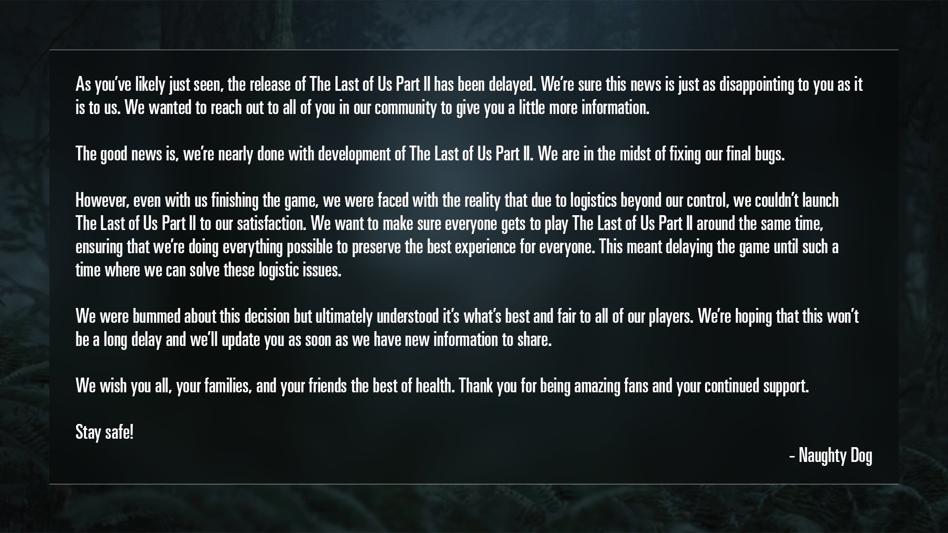 Die Corona-Pandemie beeinflusst momentan die Menschen und so ziemlich alle Industriezweige. Dabei macht der Virus auch nicht vor der Videospieleindustrie halt und so hat Sony nun bekannt gegeben, dass man The Last of Us Part II und Iron Man VR auf unbestimmte Zeit verschieben muss. Dank der Corona-Pandemie ist man logistisch nicht in der Lage alle Spieler entsprechend zu beliefern und möchte Enttäuschungen vorbeugen.