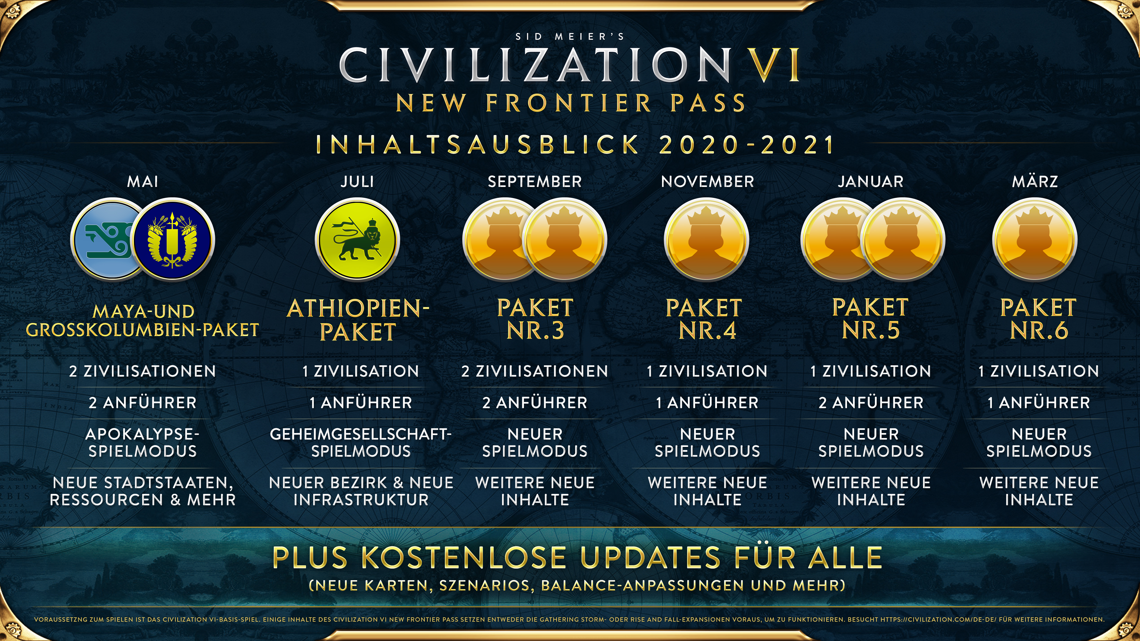 Der Civilization VI - New Frontier-Pass wird für € 39.99 auf der PS4 erhältlich sein. Zudem wird es möglich sein, jedes DLC-Paket auch einzeln zu erwerben. Zuerst erscheint am 21. Mai 2020 das Maya- und Großkolumbien-Paket, das Anführer der jeweiligen Zivilisation, einen neuen Apokalypse-Spielmodus, neue Stadtstaaten, Ressourcen und Naturwunder enthält.
