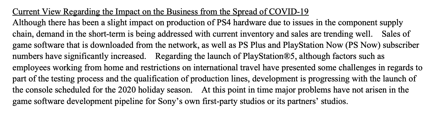 Mit dem Geschäftsbericht für das vergangene Jahr (das Fiskal-Jahr 2019 endete am 31. März) hat Sony nicht nur Zahlen für die PlayStation 4 Hardware, Softwareverkäufe und Nutzerzahlen für PlayStation Plus veröffentlicht, sondern auch ein Status-Update für den bevorstehenden Launch der PlayStation 5 gegeben. Zwar hatte und hat auch die COVID-19 Pandemie Auswirkungen (Working at Home und Reisebeschränkungen bei der Qualifizierung von Produktionslinien), doch befinde man sich immer noch im Zeitplan für einen Launch der Konsole in der Weihnachtszeit 2020. Ebenso soll es keine großen Probleme bei der Spielentwicklung von Sonys eigenen Studios sowie den Partner-Studios geben.