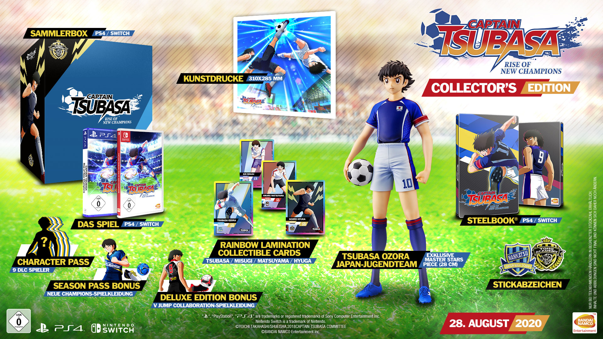 Captain Tsubasa: Rise of New Champions ist in fünf verschiedenen Editionen erhältlich: Standard, Deluxe, Collector’s (in Deutschland exklusiv bei Amazon), Champions und Legends. Zusätzlich wird ein Vorbestellerbonus angeboten: Bei der physischen Version ist dieser bei teilnehmenden Händlern bis zum Release verfügbar; bei der digitalen Version bis zum 28. September.
